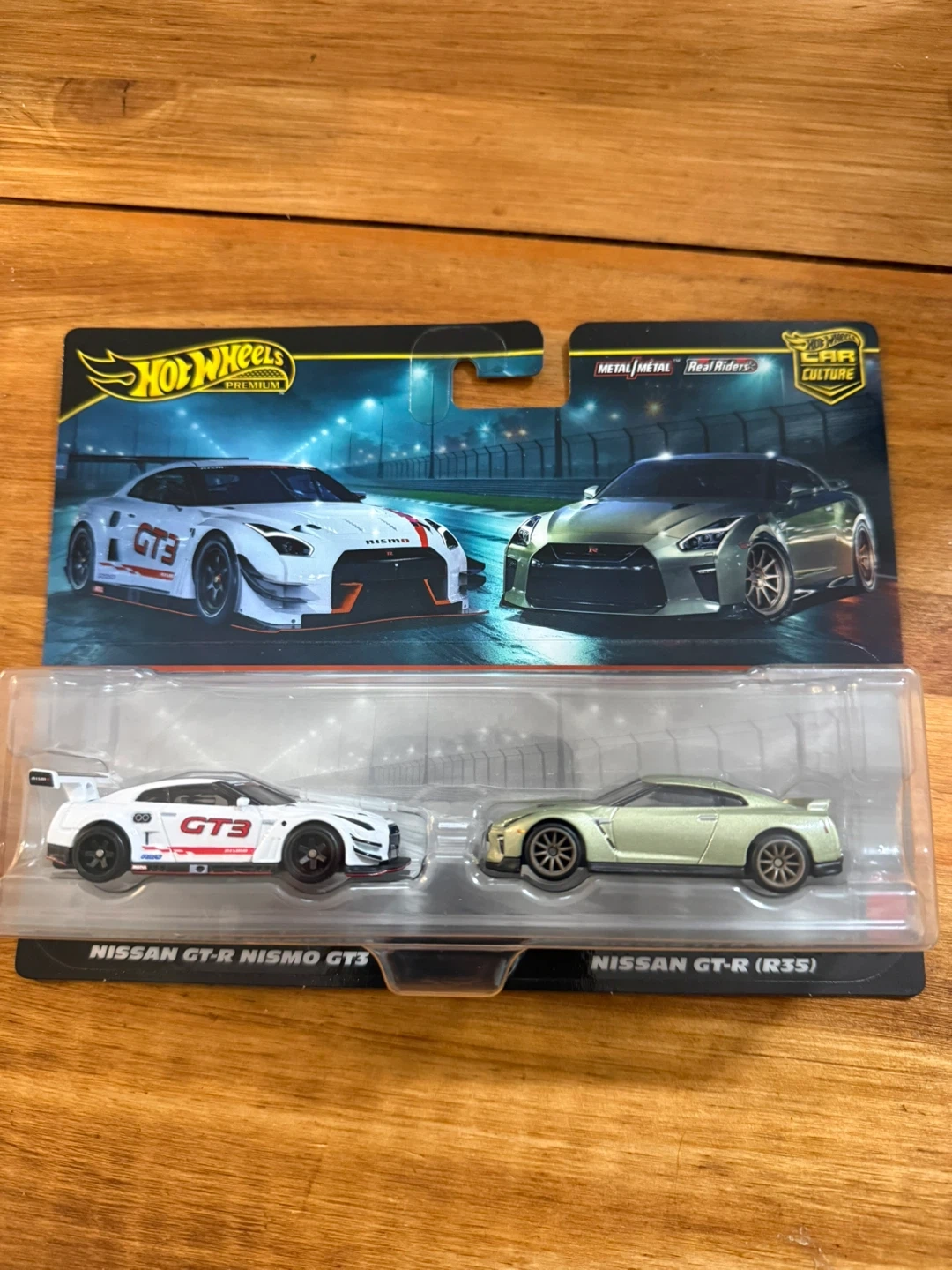 This Hot Wheels Premium Car Culture set includes two Nissan GT-R models: the GT-R Nismo GT3 and the GT-R (R35). Both cars have detailed Real Riders metal bases. They're great for collectors or for display!