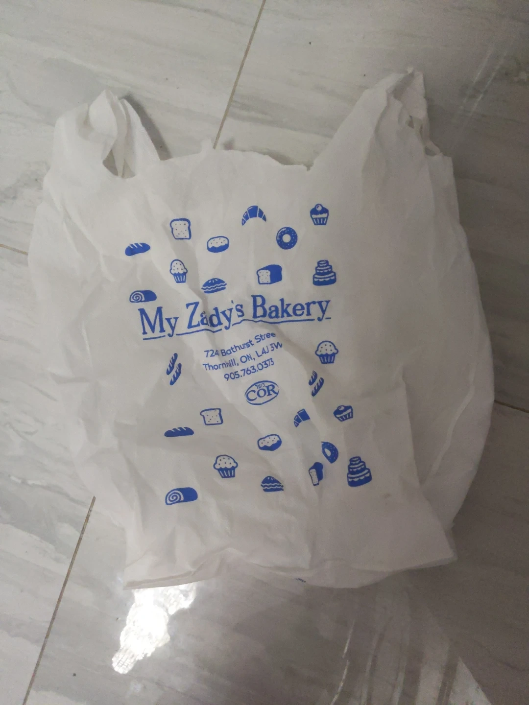 This is a plastic shopping bag from My Zady's Bakery. It features a variety of baked good illustrations.