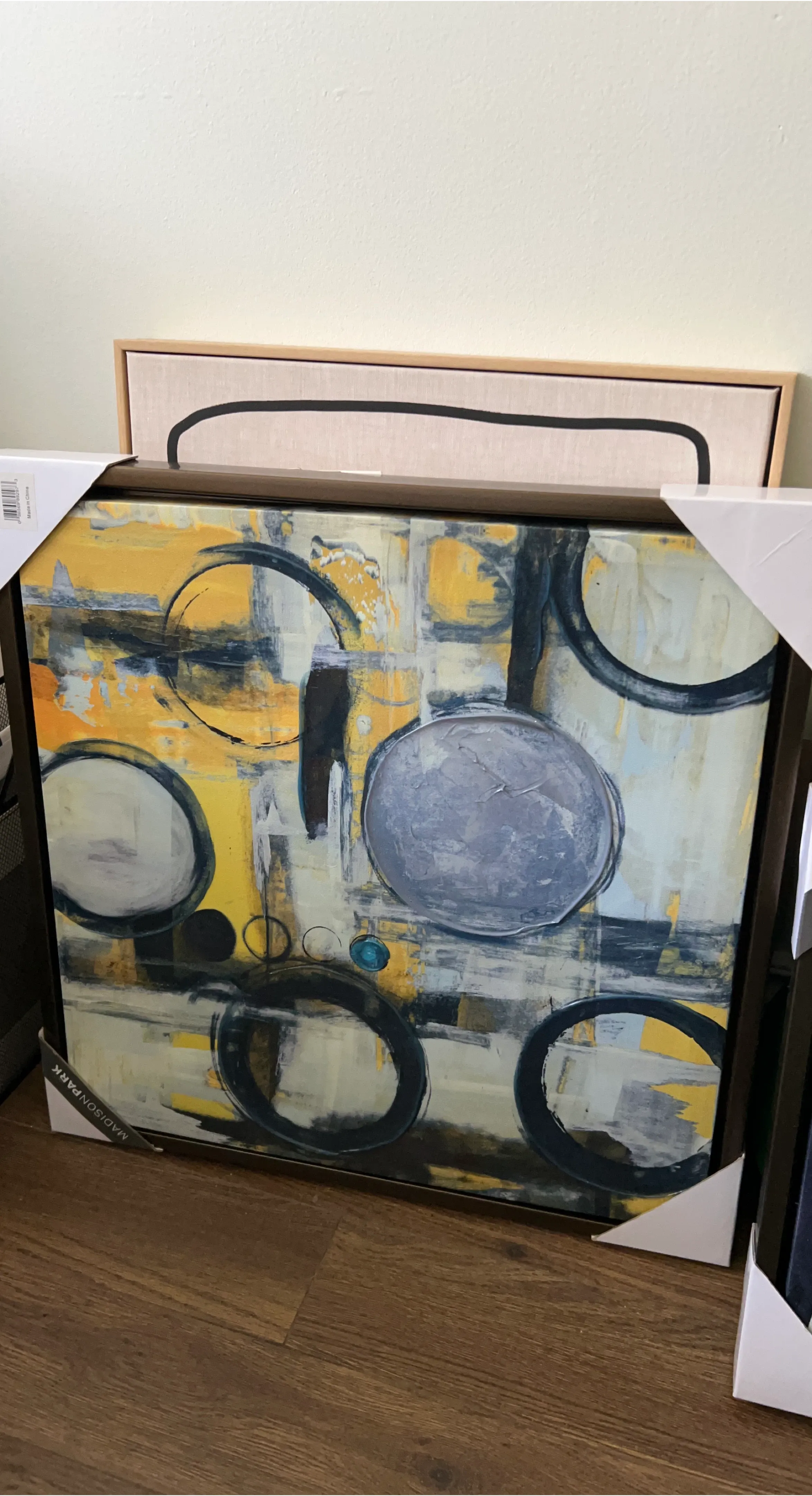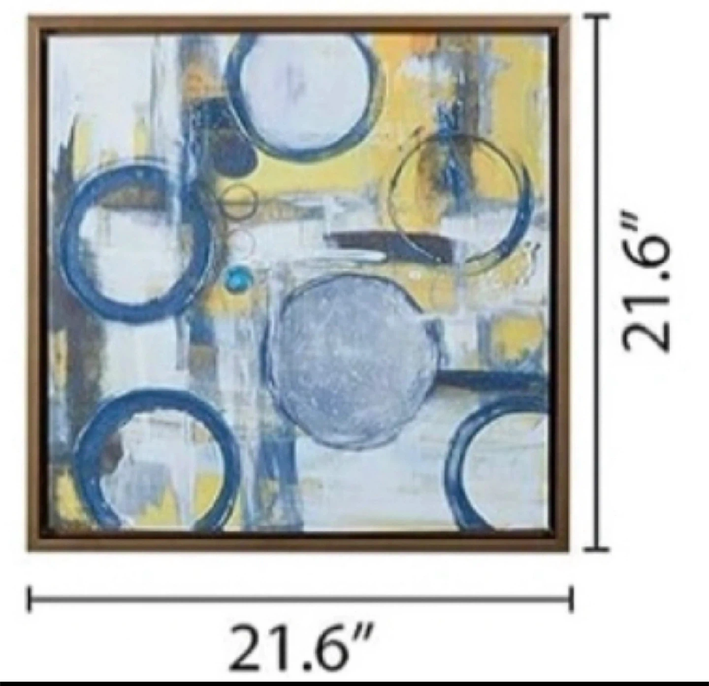 Abstract wall art featuring circles and geometric shapes in yellow, grey, and black. It's framed and ready to hang. Dimensions are 21.6" by 21.6".