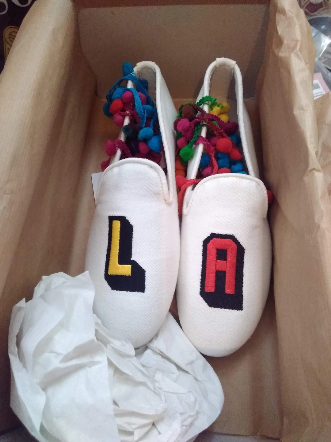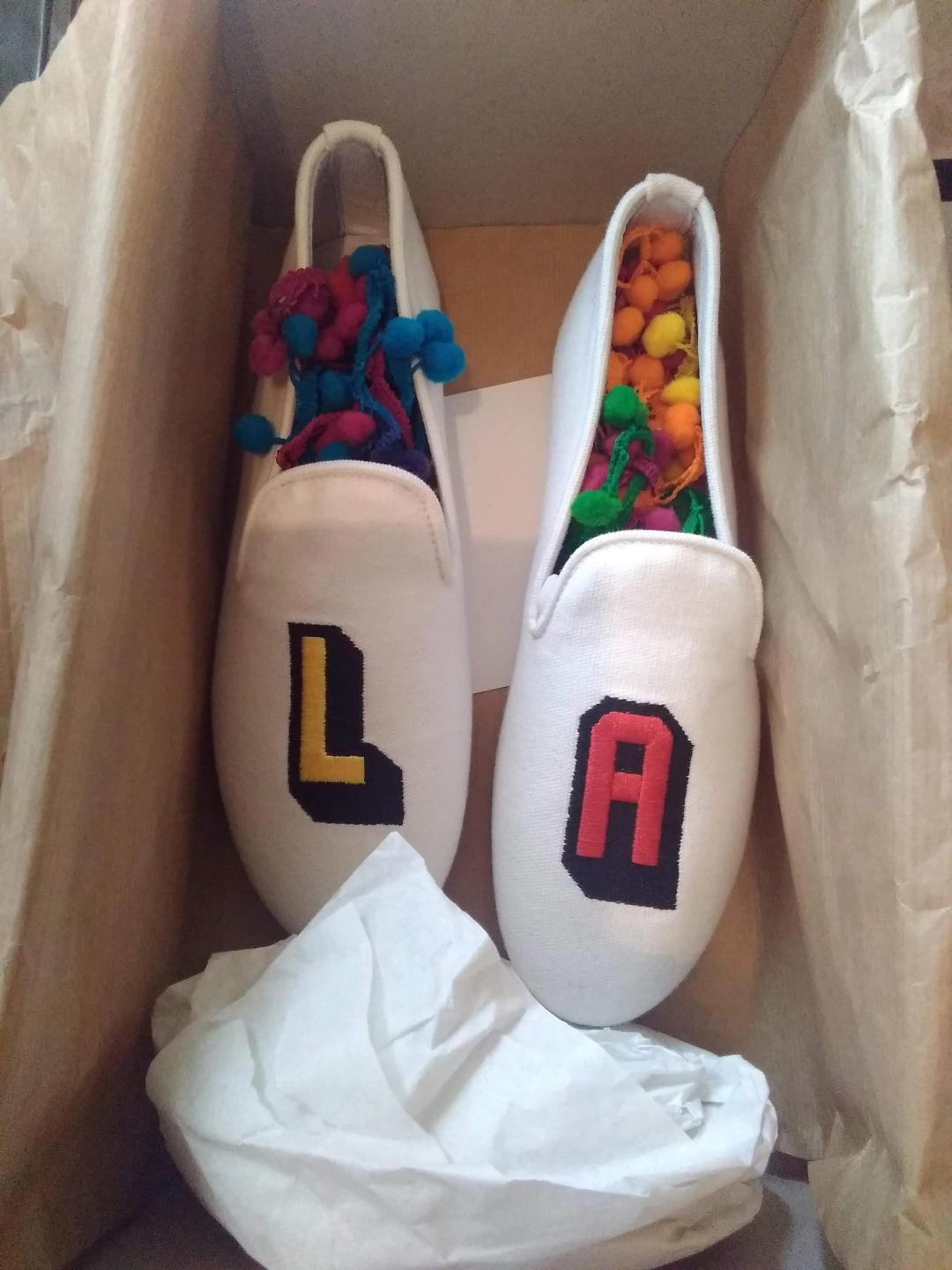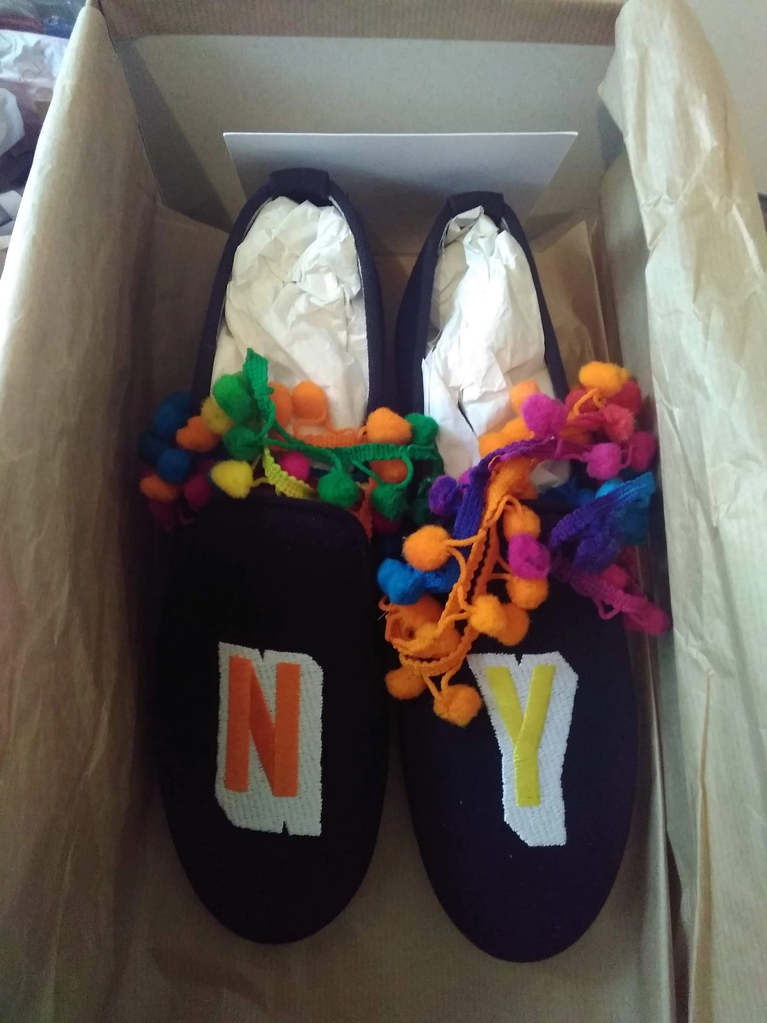 Authentic Pair of Joshua Sanders loafers. Features colourful pom-poms and embroidered lettering. Made in Italy. New with box. LA or New York your choice. Brand new. Regular retail price $320