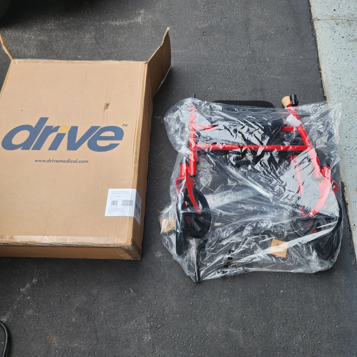 This Drive Medical folding walker is red. It comes in its original box. It's designed for easy portability and storage.