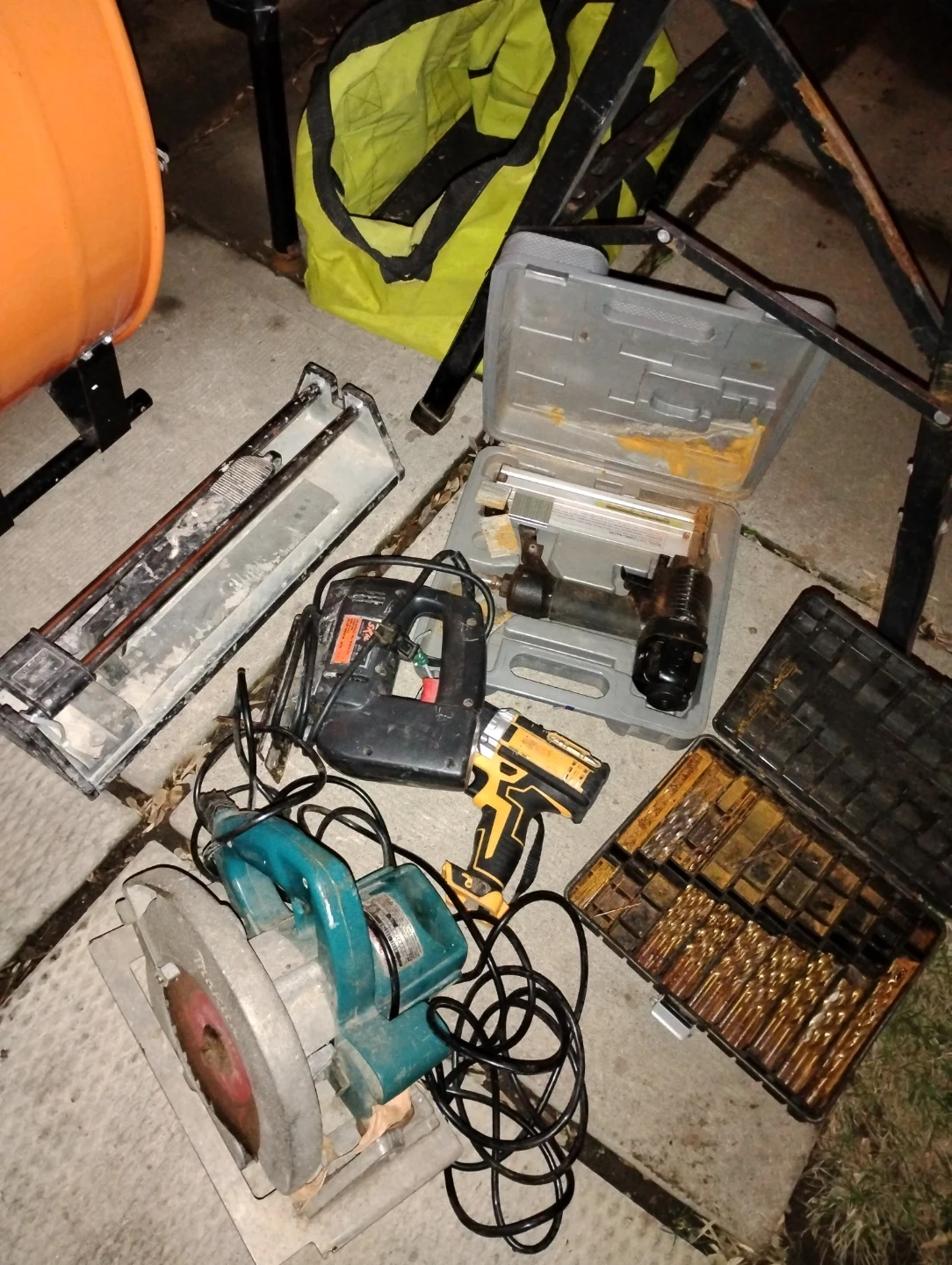 Includes a Makita circular saw, a yellow and black drill, a black jigsaw, and a tile cutter. Also includes a variety of drill bits and a staple gun.
