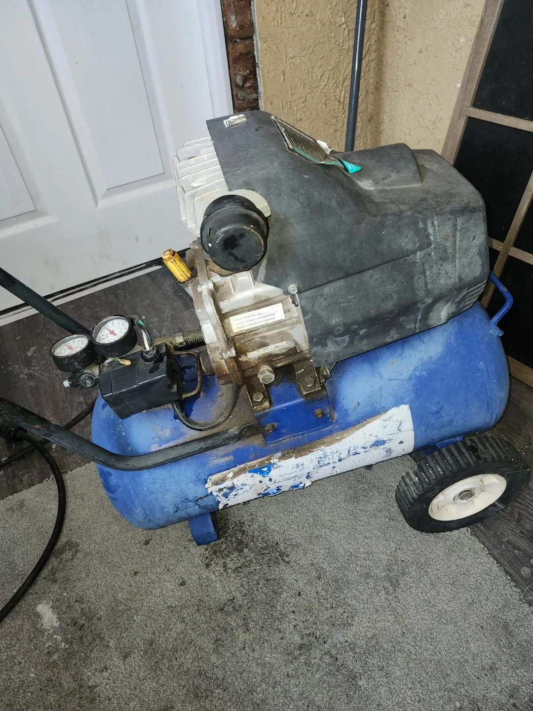 Campbell Hausfeld air compressor with dual gauges. This unit is portable and designed for various workshop tasks. It has a durable blue tank and wheels for easy transport.builds up to 25psi
