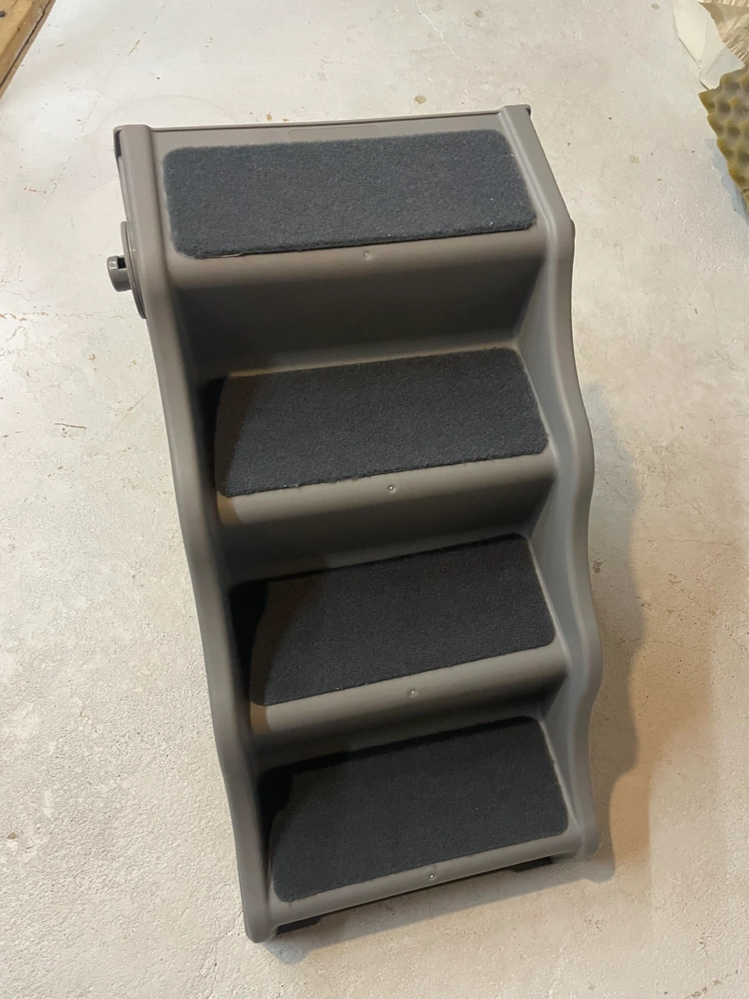 Grey 4-step pet stairs. These stairs are made of durable plastic with carpeted treads for traction. They're great for helping smaller dogs or older dogs get onto furniture or into vehicles. Can support pets up to 150 lbs. Never used!