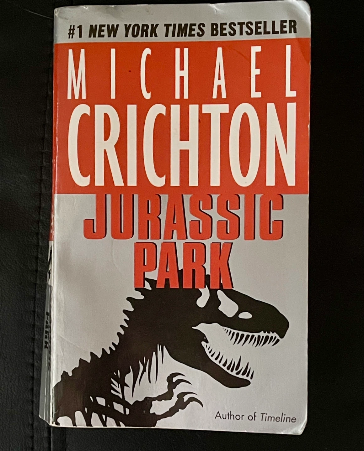 This is Michael Crichton's "Jurassic Park" paperback book, a #1 New York Times bestseller. It's a thrilling science fiction novel about a theme park with genetically engineered dinosaurs. The book is in very good condition