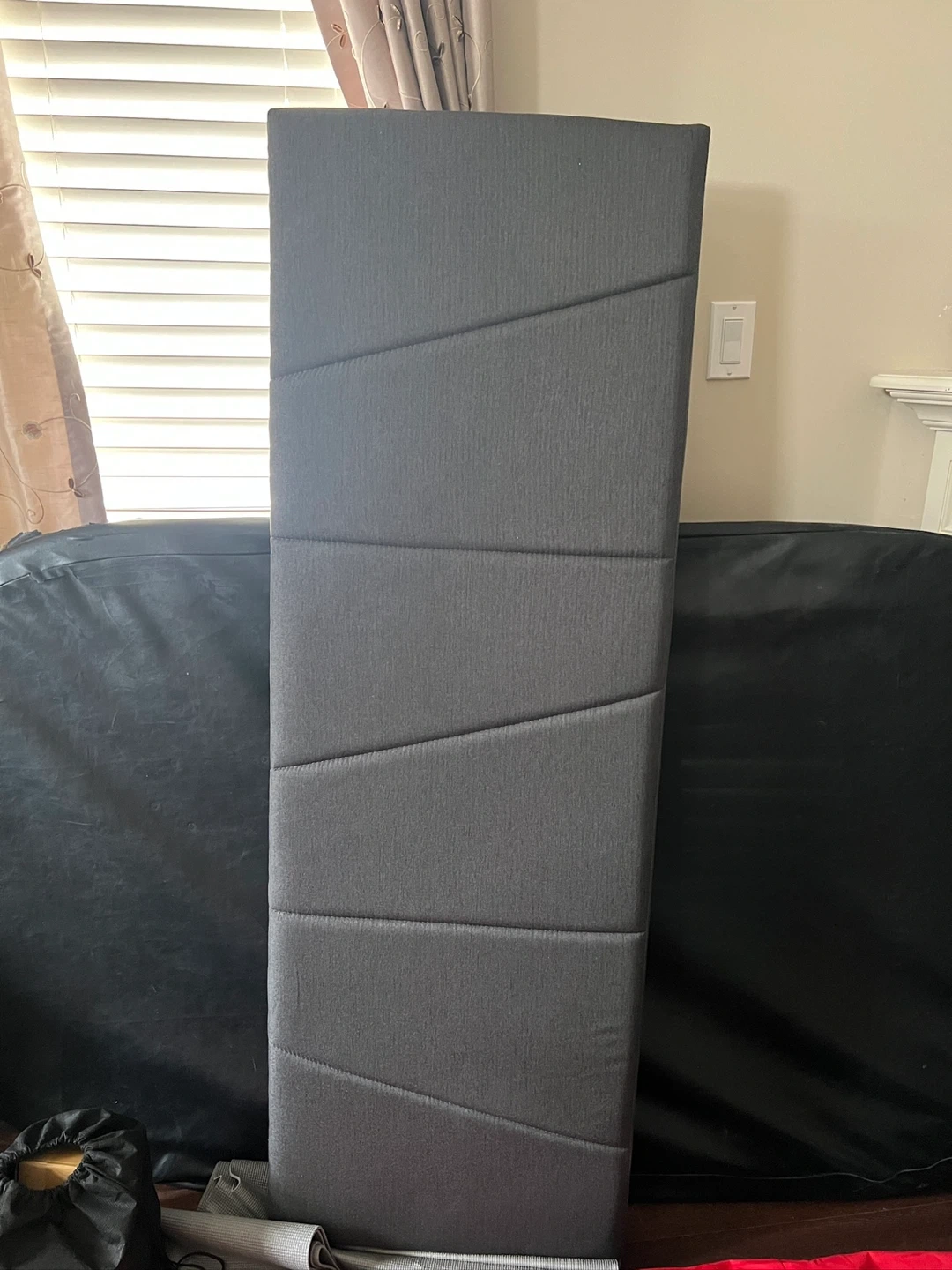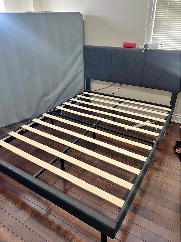Stylish dark gray upholstered bed frame. Platform style so no box spring needed. Has sturdy wooden slats for mattress support. Headboard is comfy and modern. Easy to put together.