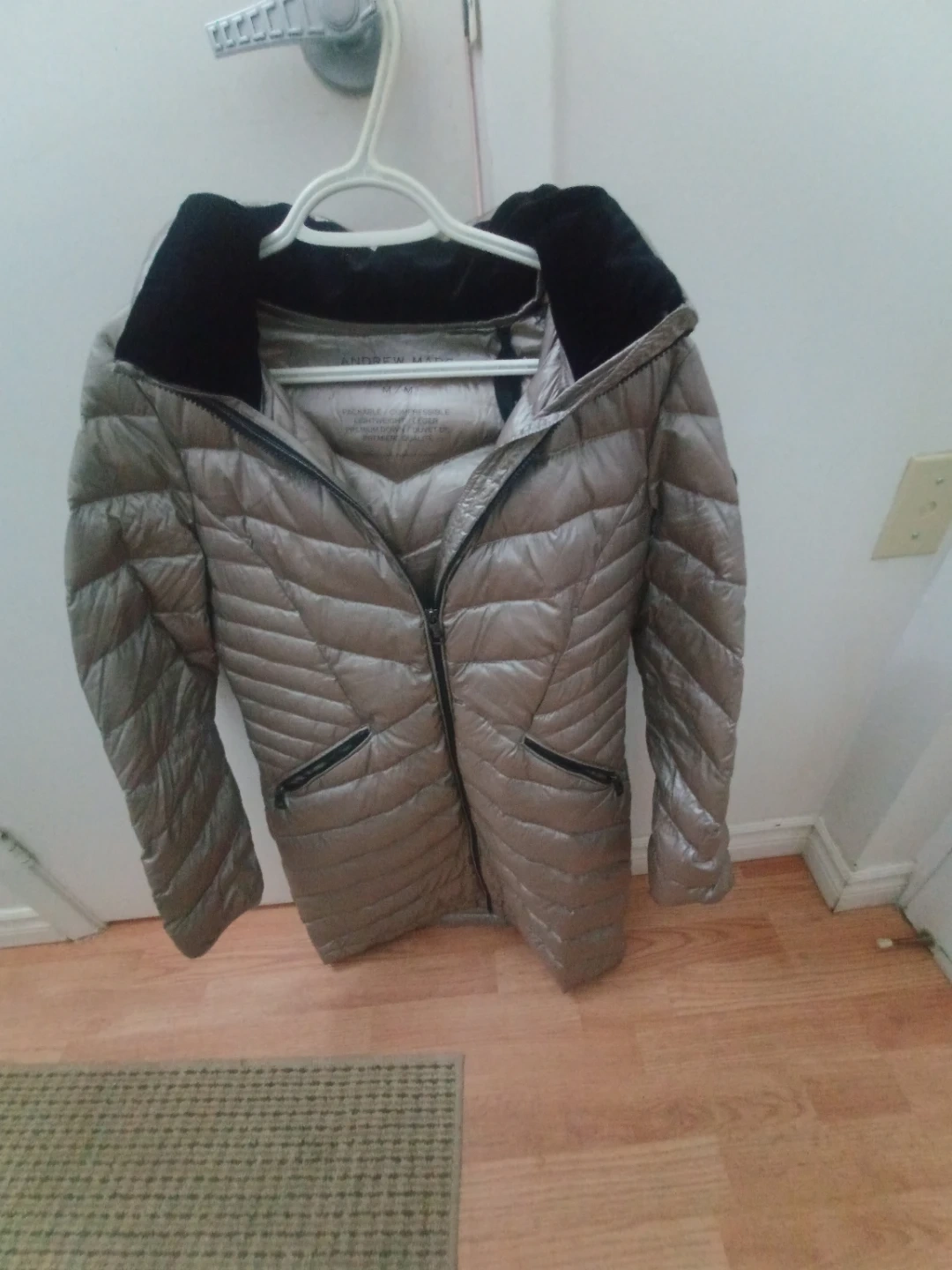 2 shiny champagne-coloured womens puffer jacketst. It has a full zip closure . The brand tag reads 'Andrew Marc.