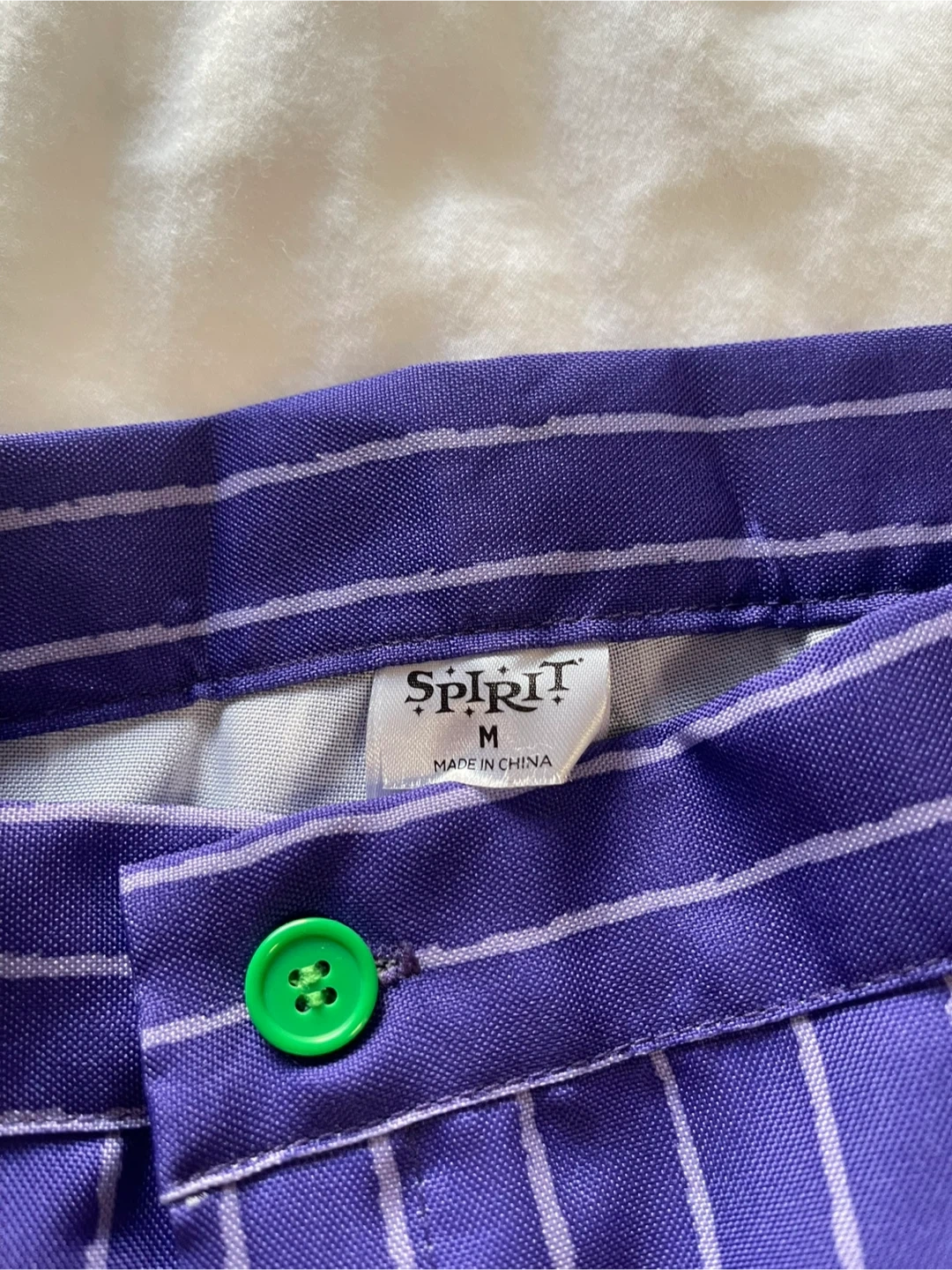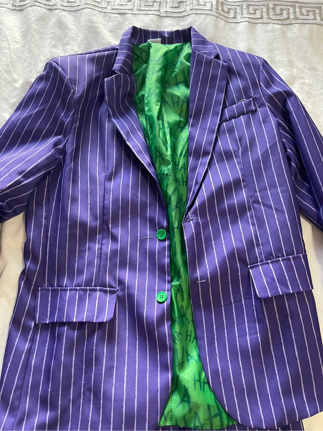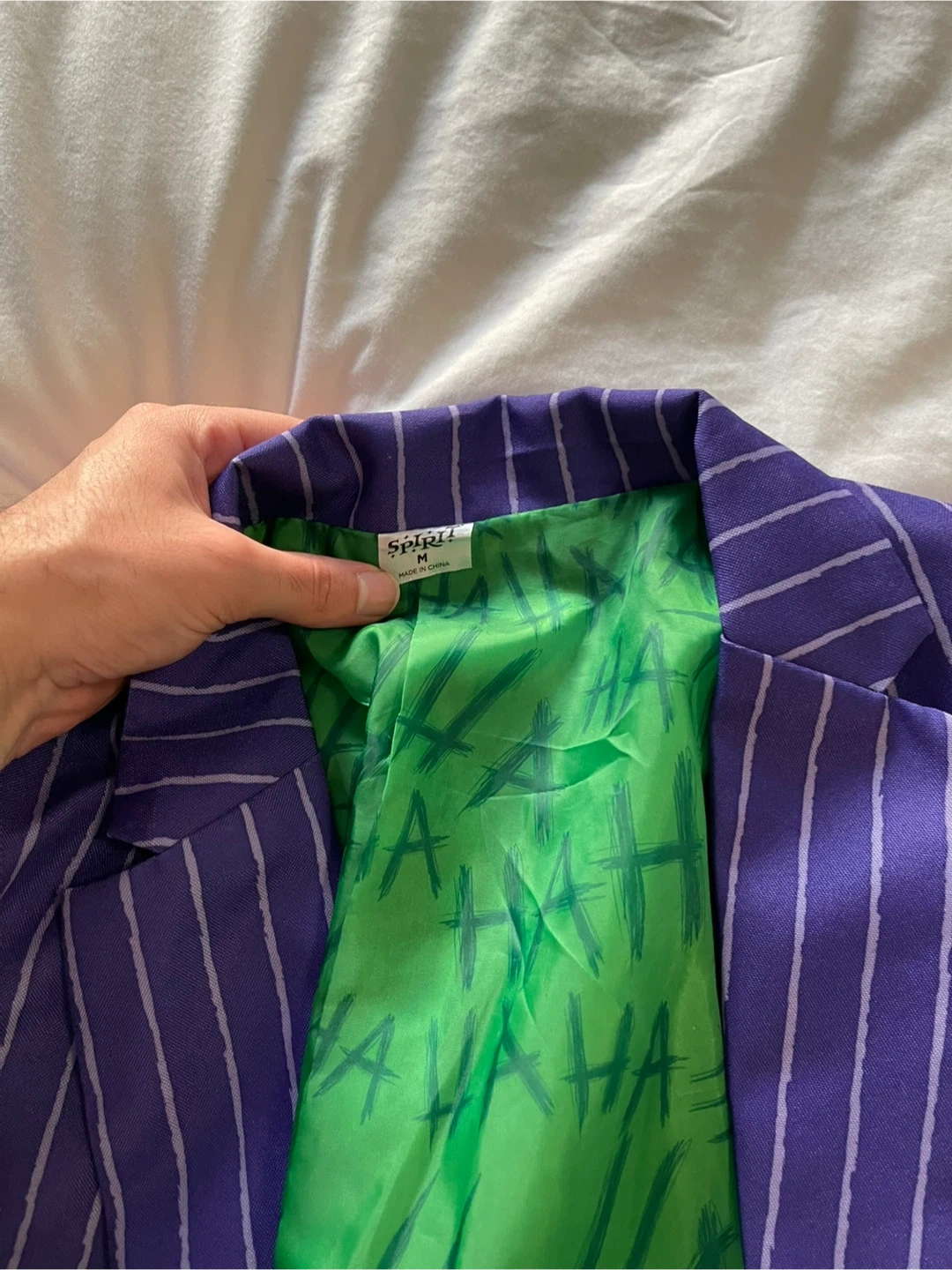This is a Spirit Halloween Joker costume suit set. It's a size medium with purple pinstripe jacket and pants. The inner lining of the jacket has a green "HA HA" print.