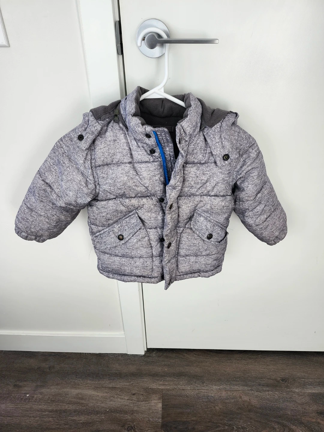 Cozy grey puffer jacket from Baby Gap. Barely worn. Features a full zip closure with snap buttons and a hood. Made with a polyester blend for warmth. Perfect for keeping little ones snug during cooler weather!