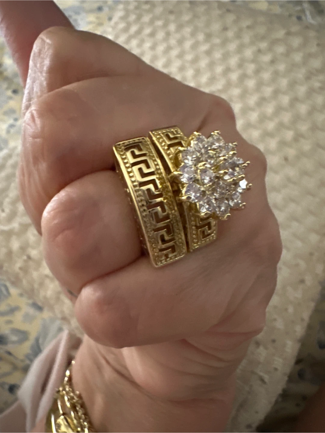 This dazzling ring set features a flower cluster top with clear cubic zirconia stones. It includes a matching band with a Greek key pattern. Gold tone metal construction.