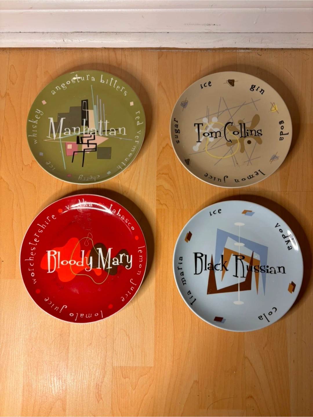 $40 or best offer - Stylish set of 4 modern cocktail / appetizer plates by Muti Art, designed by Angelo Bruno. Each plate features a bold, graphic cocktail-themed design (vodka, martini, tomato juice, etc.) with a sleek, contemporary aesthetic.