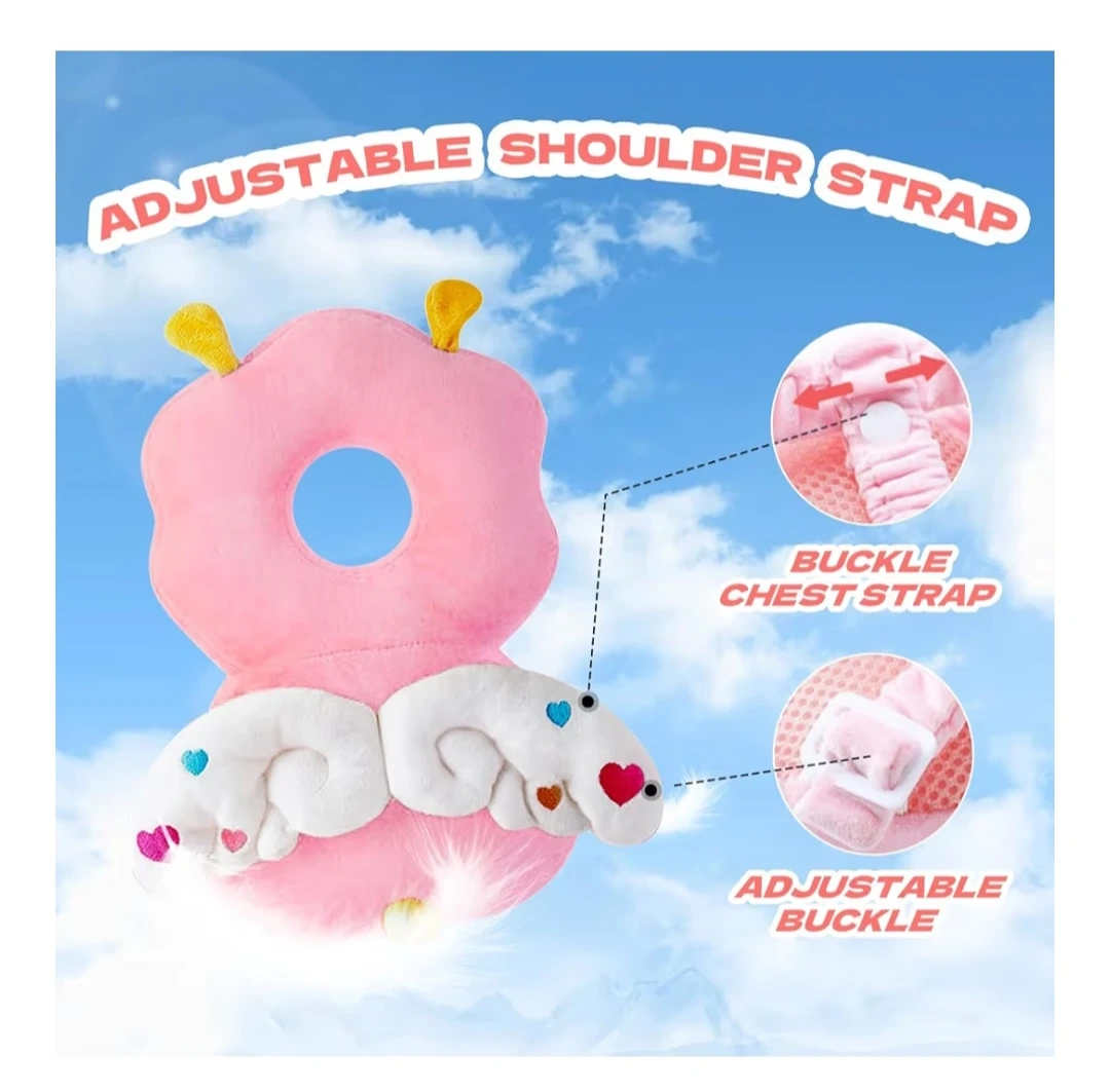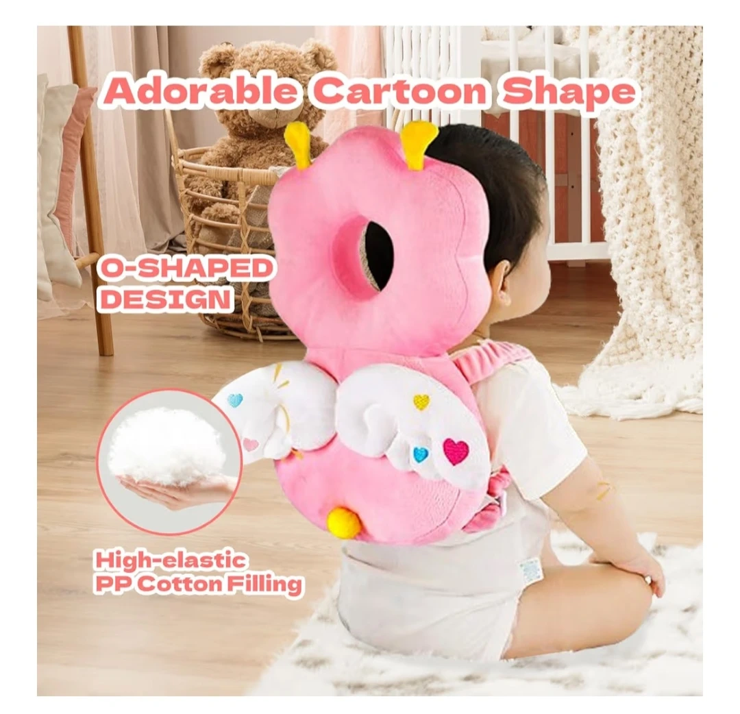 This baby head protector backpack features an adorable cartoon shape with wings and high-elastic PP cotton filling for nice shock absorption. It has an adjustable shoulder and chest strap for a secure fit. O-shaped design.