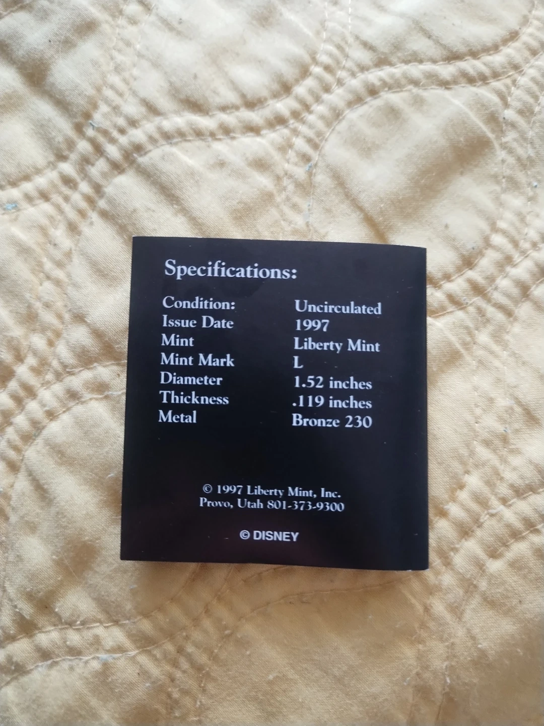 Comes in a red velvet box and includes the certificate guarantee that this exclusive commemorative medallion is minted in Bronze 230. It was issued in 1997 by Liberty Mint and has a diameter of 1.52 inches and a thickness of .119 inches.