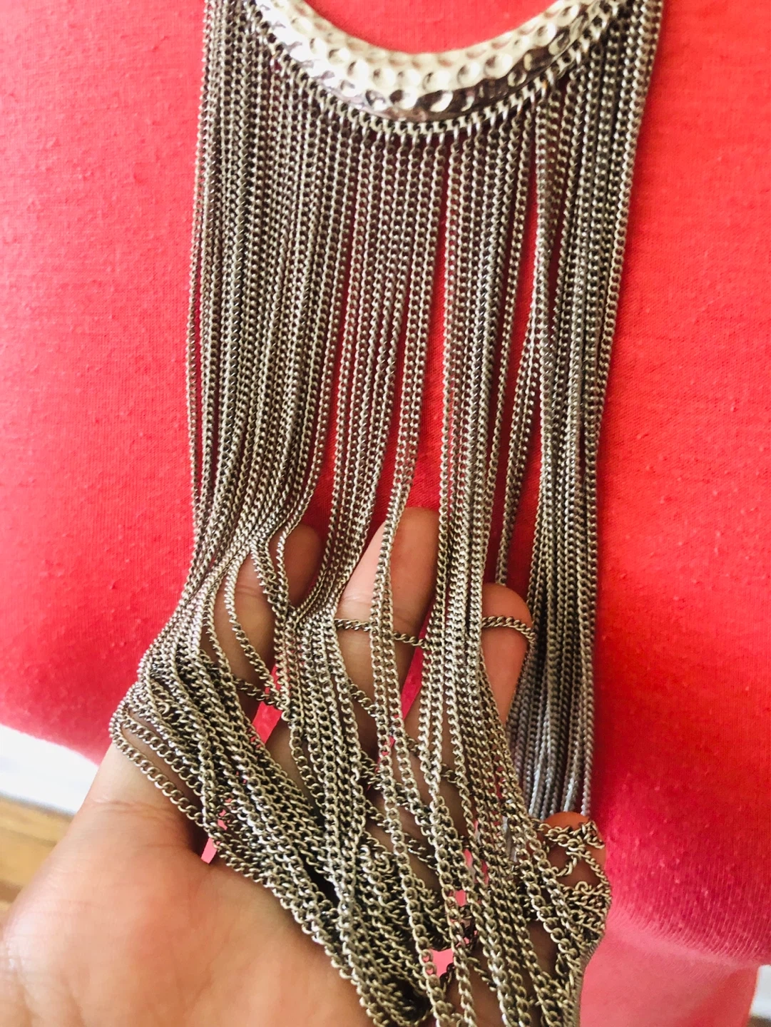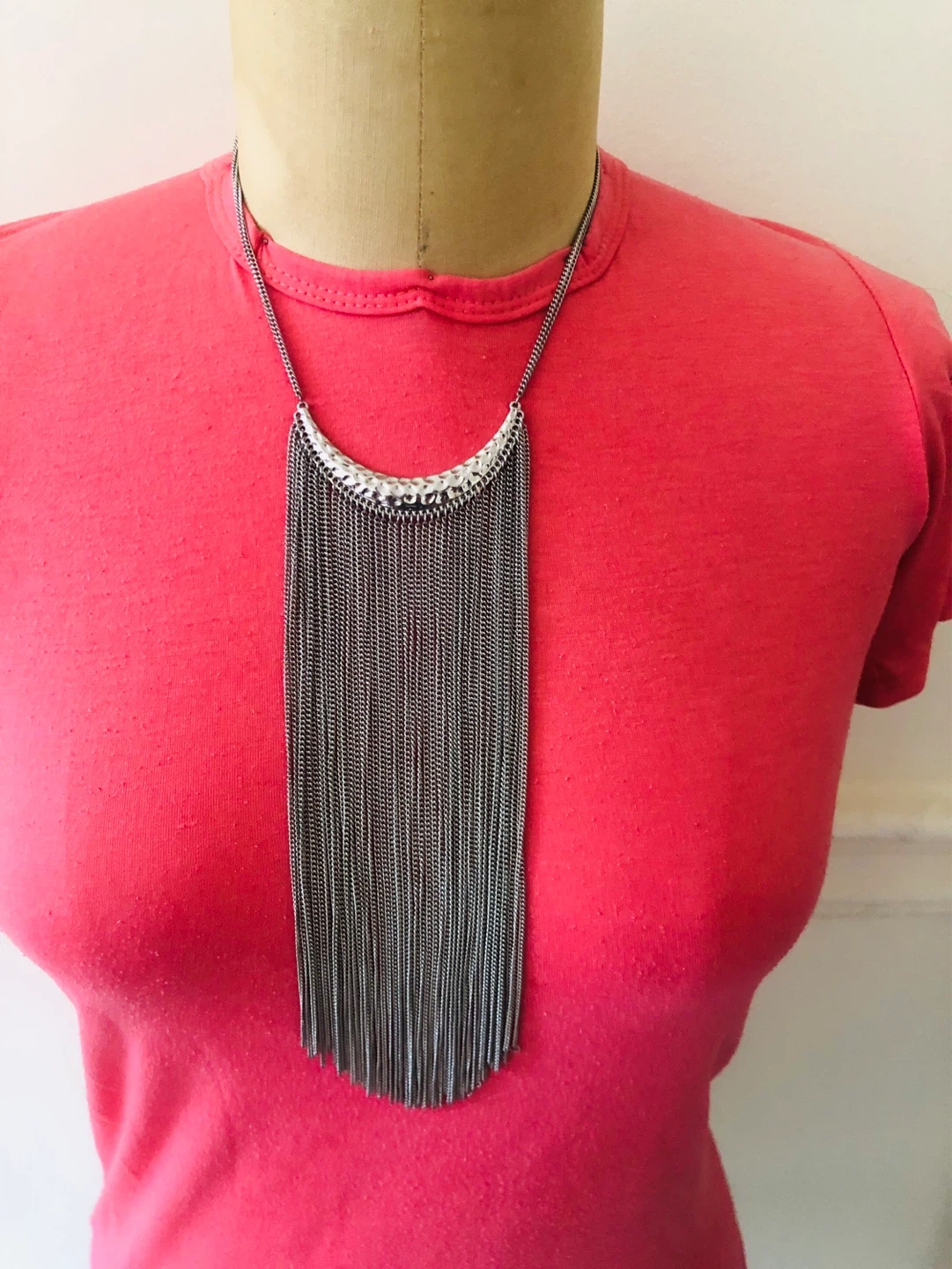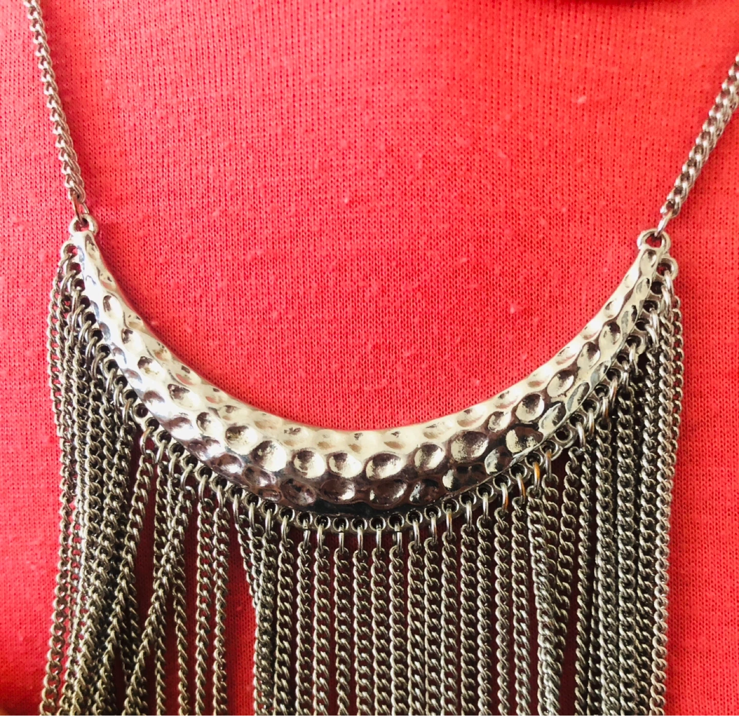 This eye-catching necklace features a hammered silver-tone pendant with a cascade of delicate silver chains. It's adjustable for a comfortable fit. Perfect for adding flair to any outfit!