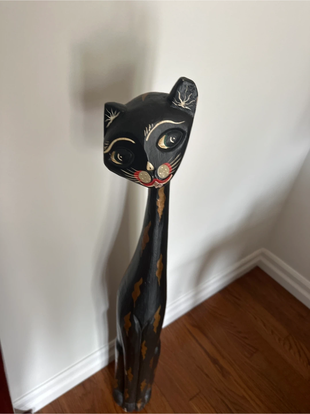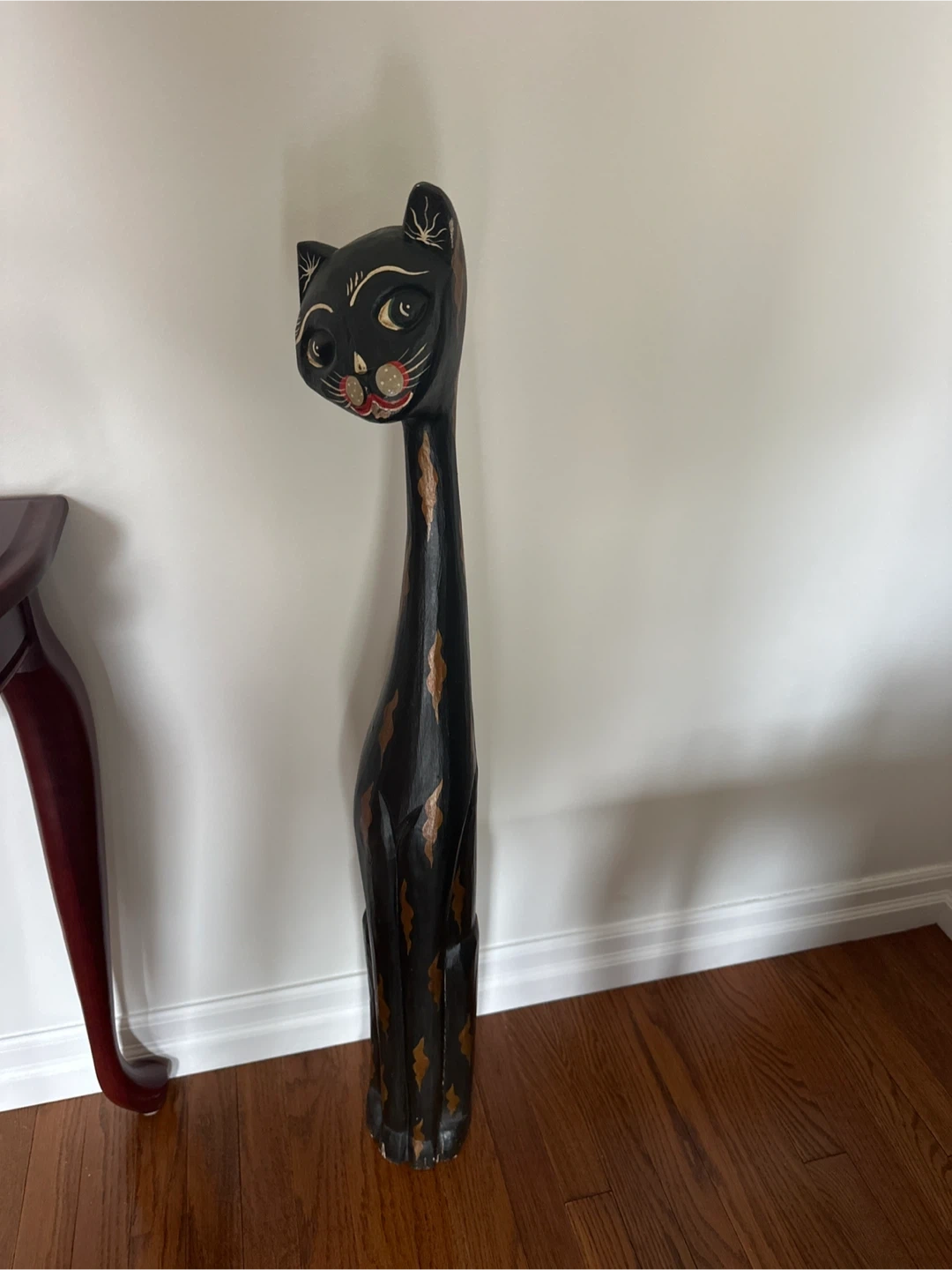 This is a striking wooden figurine of a black cat. It's hand-painted with detailed facial features and a decorative pattern along its body. It stands tall, adding a unique accent to any room. 39 inches tall