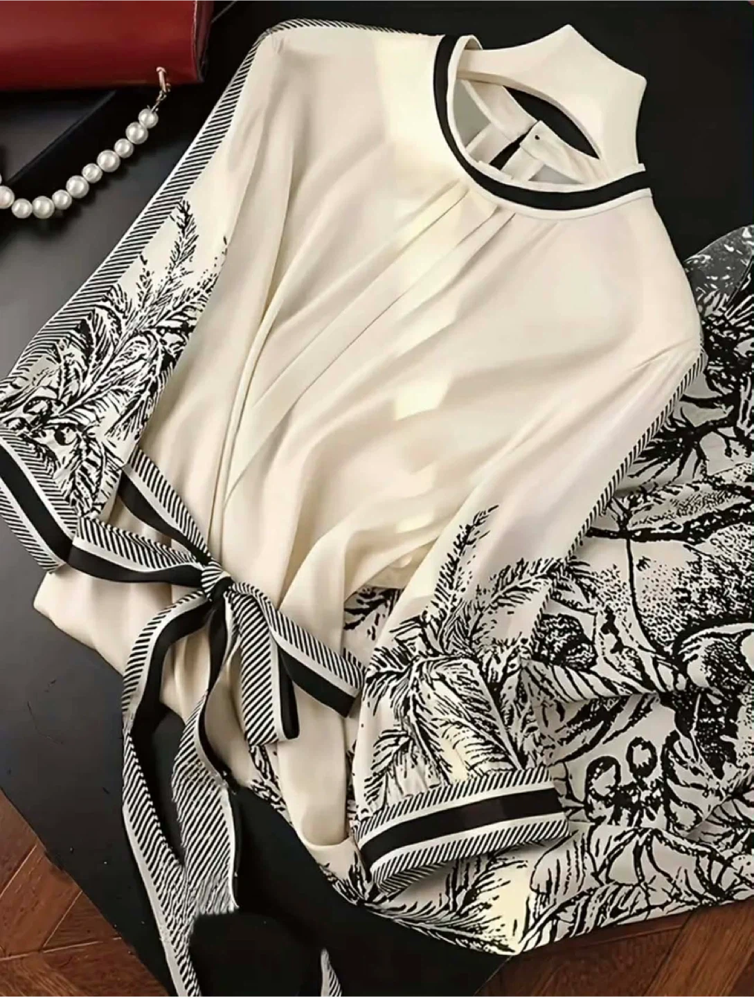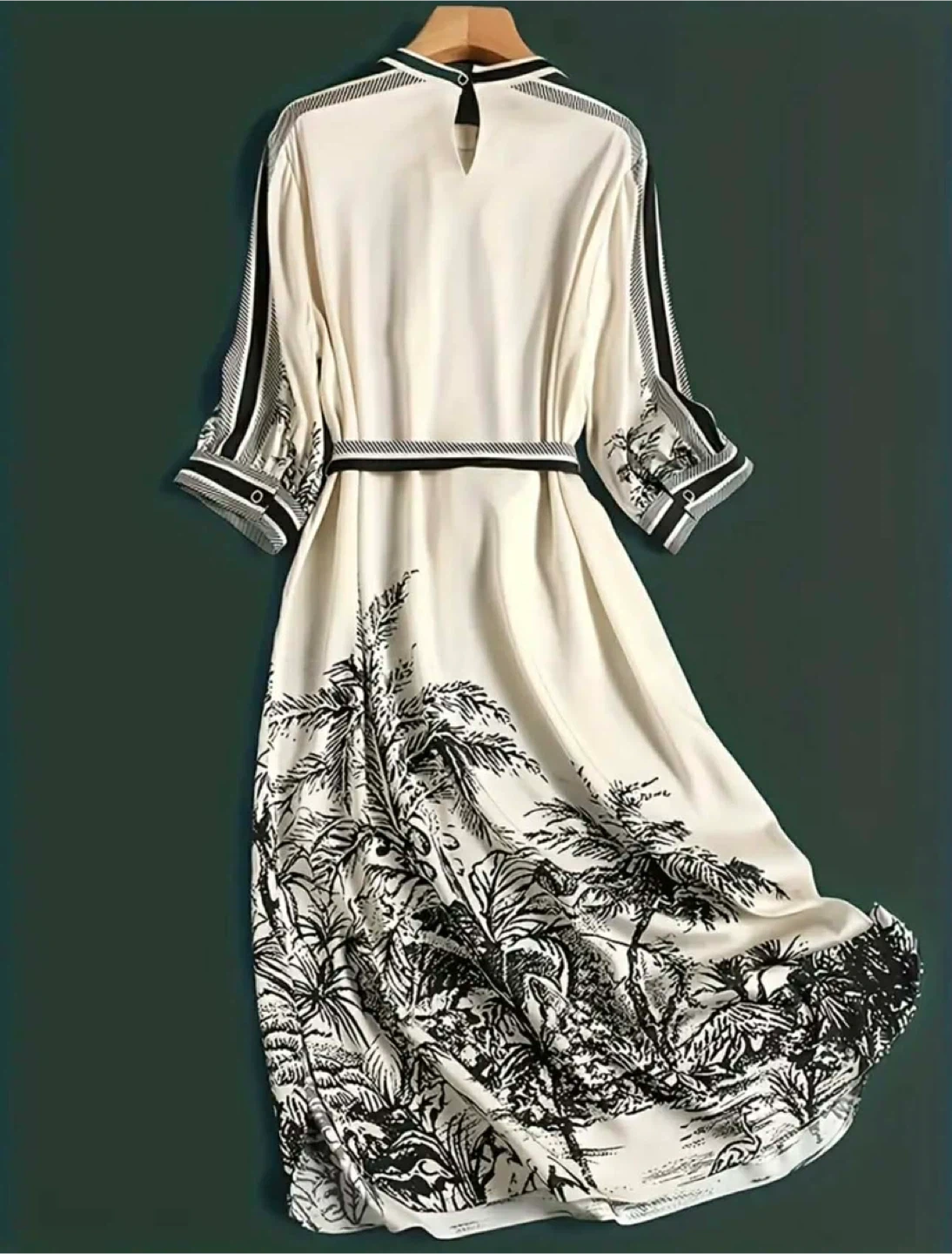 Cream midi dress with a striking black tropical print. It features a flattering tie-waist and elegant long sleeves. Fabric has a nice drape.