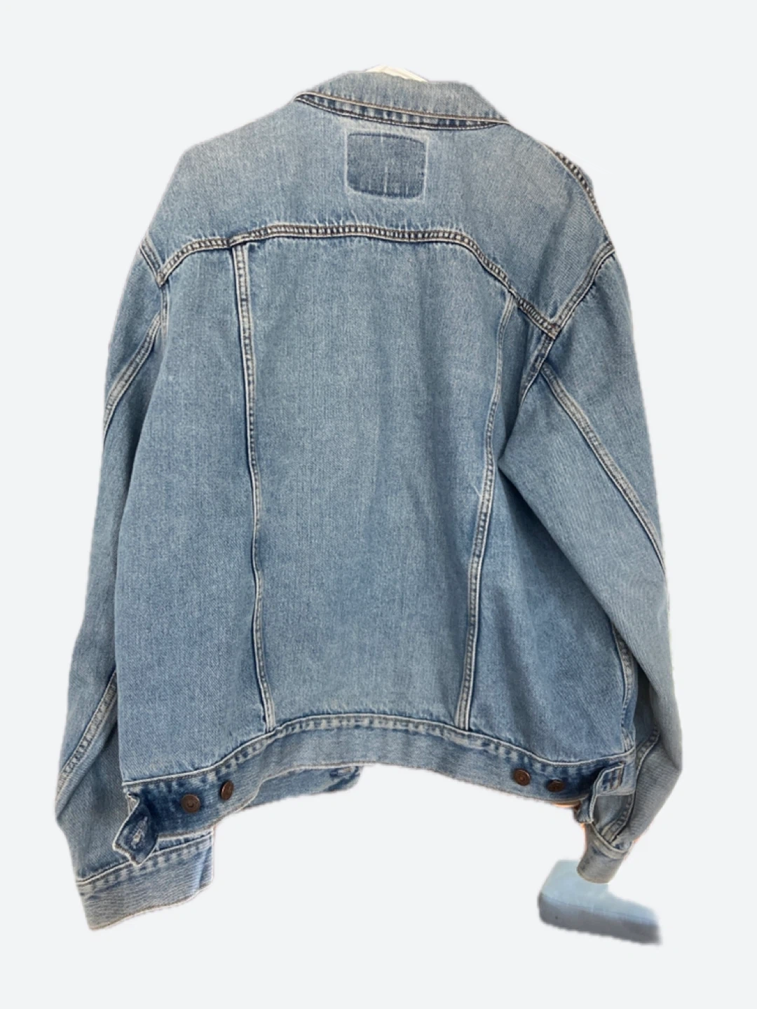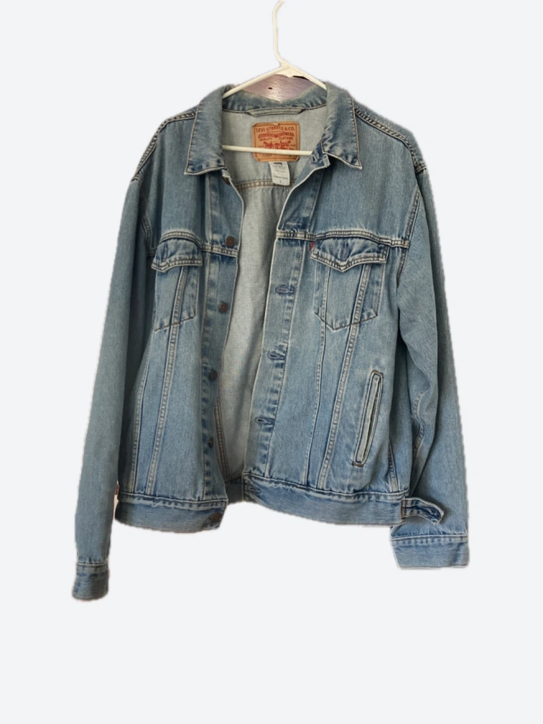 This is a classic blue denim trucker jacket from Levi's. It's made of 100% cotton for durability and comfort. Standard metal button closure and chest pockets.
