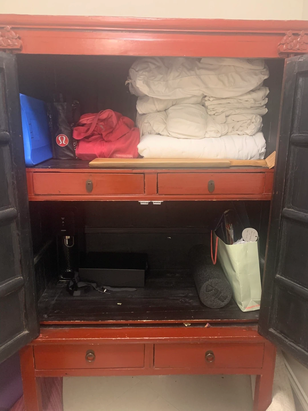This red cabinet has a distinct Asian design. It features two doors on the top section and two drawers below. Ample storage space is available inside for linens or other household items. It's a unique piece for any room!