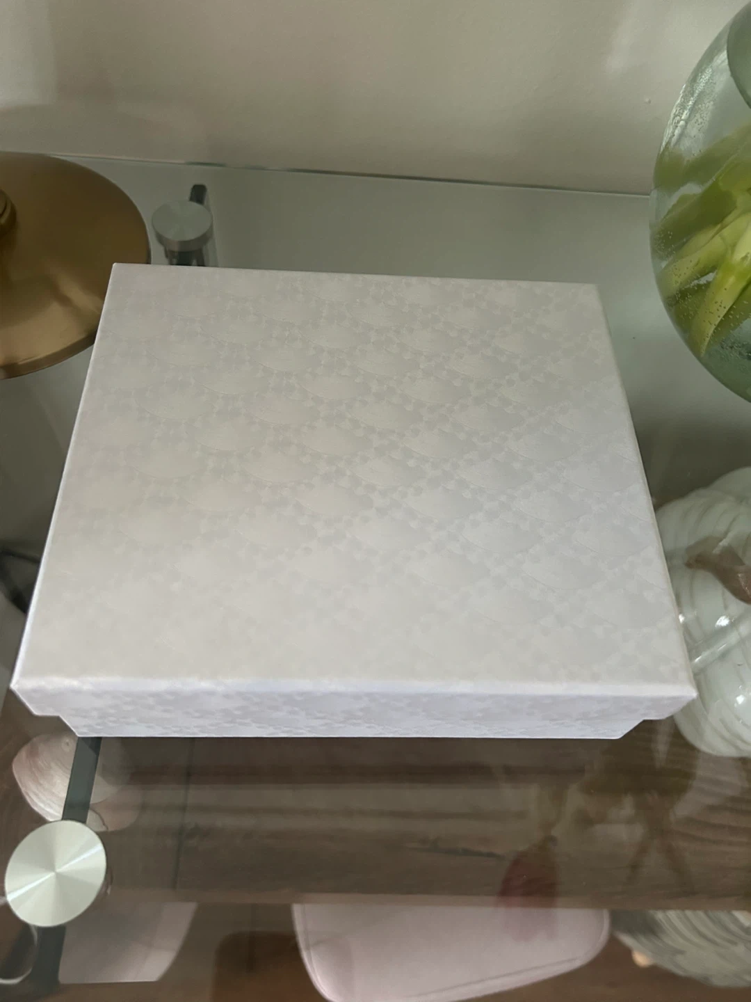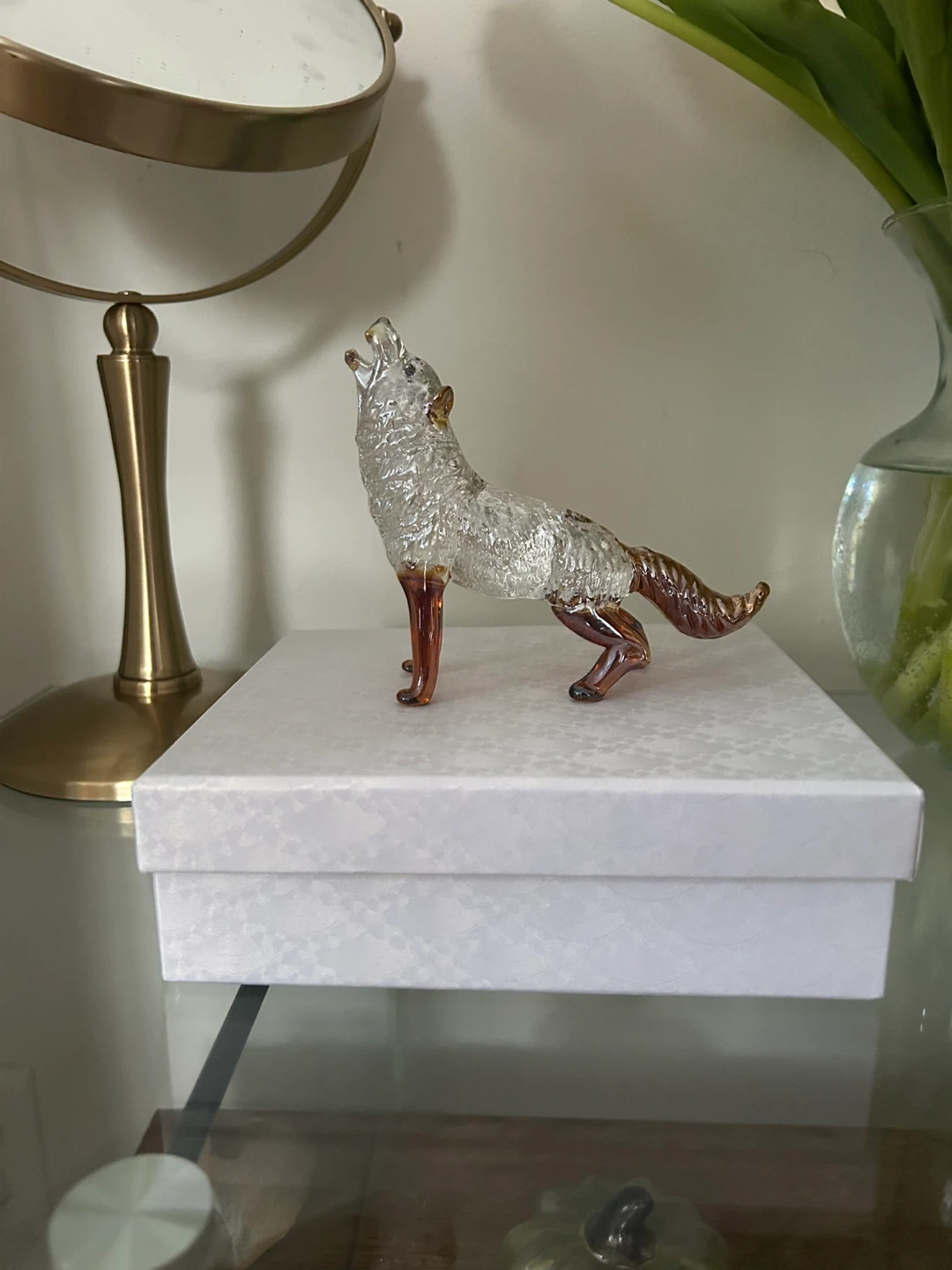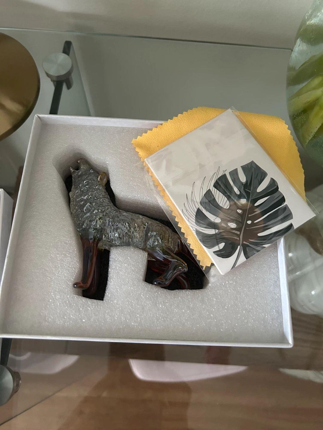 This is a decorative glass wolf figurine. It's clear with amber accents on its legs and tail. Comes in a presentation box with a cleaning cloth.