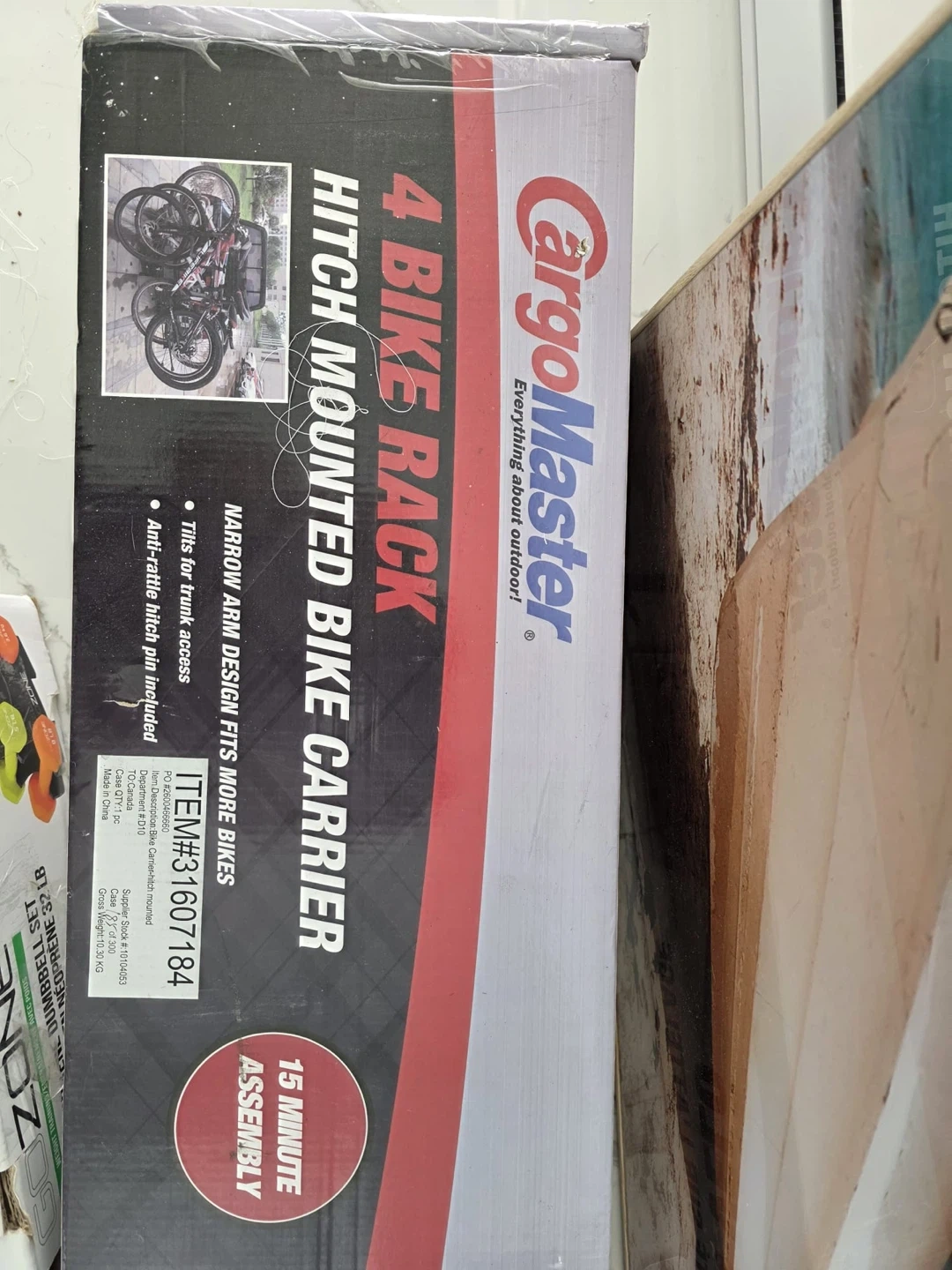 CargoMaster 4 bike hitch mounted bike carrier. It has a narrow arm design that fits more bikes. Includes tilts for trunk access and an anti-rattle hitch pin. Assembly takes 15 minutes.