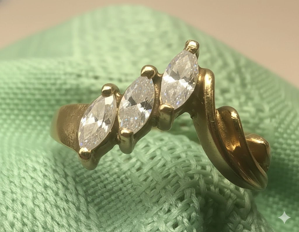 Condition: The 10K gold band is in excellent structural condition with clear hallmarks and a high-polish finish. Please Note: One of the three marquise CZ stones is missing from the setting. This ring is priced accordingly and is an ideal candidate for a simple stone replacement or for its high gold weight.