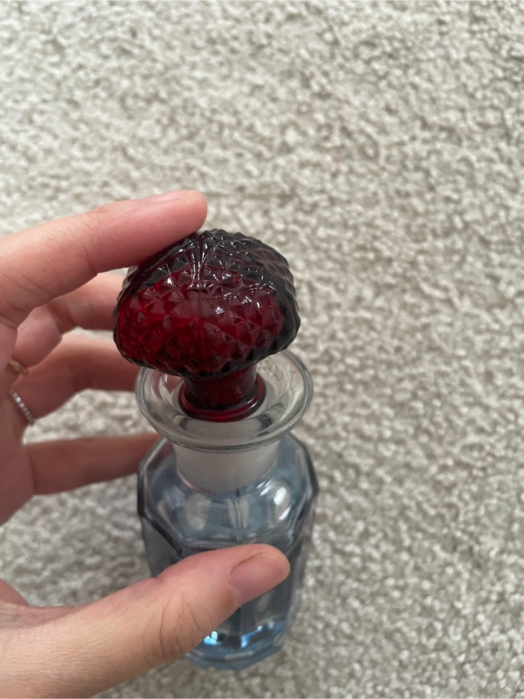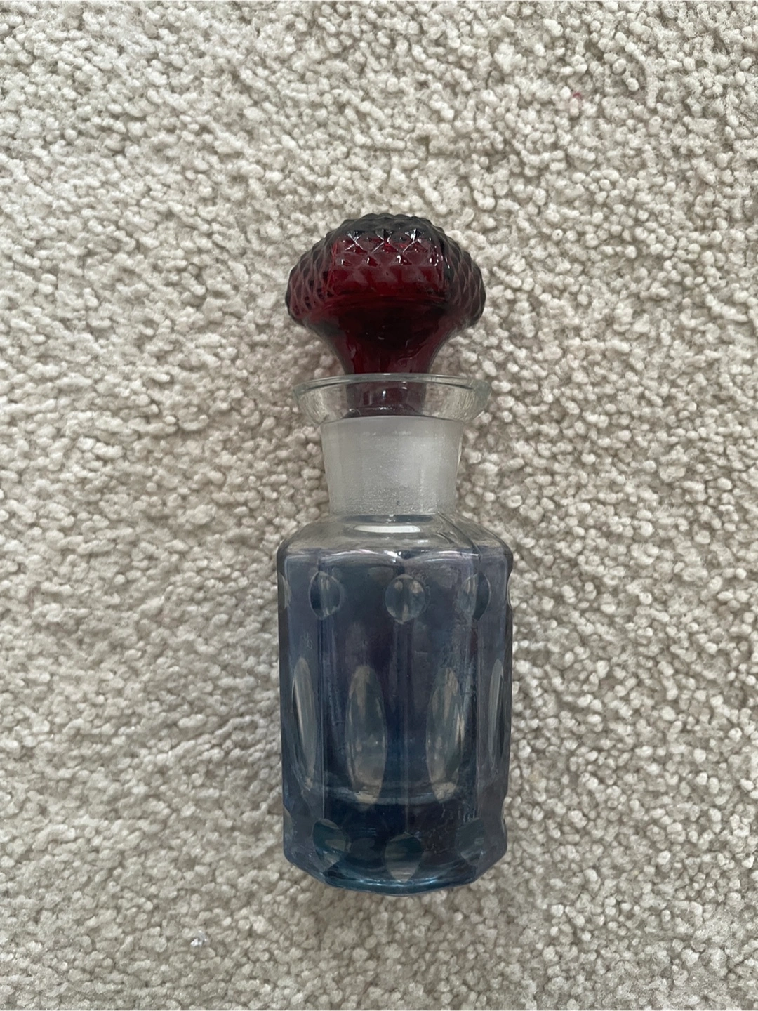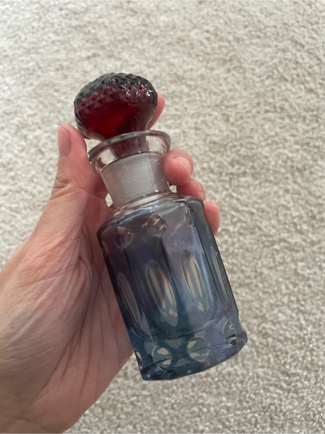 Beautiful glass perfume bottle with a decorative red stopper. It's made of blue-tinted glass with an octagonal base. This bottle was made in India. It's a lovely piece for displaying on a dresser or vanity.