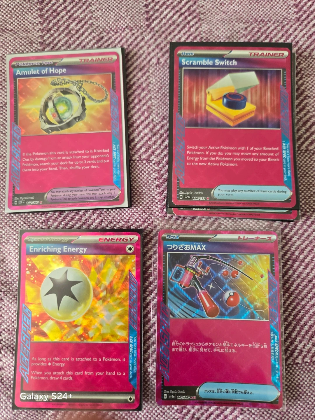 Includes Amulet of Hope, Scramble Switch, Enriching Energy, and Tsuyosabo MAX trainer cards. These are for the Pokemon Trading Card Game. Great for collectors or players!