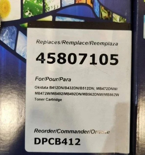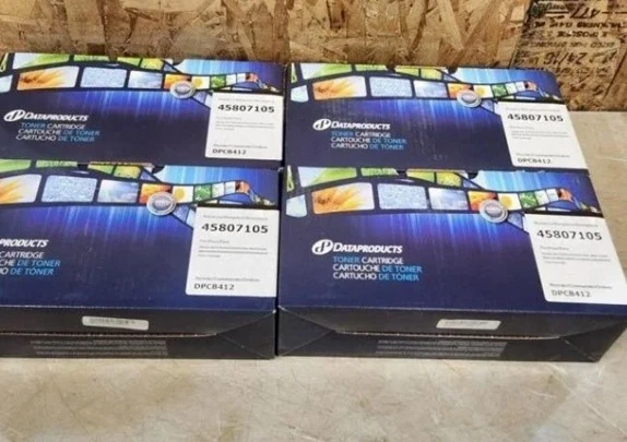 Set of four Dataproducts 45807105 toner cartridges. These are for Okidata B412DN/B432DN/B512DN/MB472DNW/MB472W/MB492/MB492DN/MB562DNW/MB562W printers. These are toner cartridges.