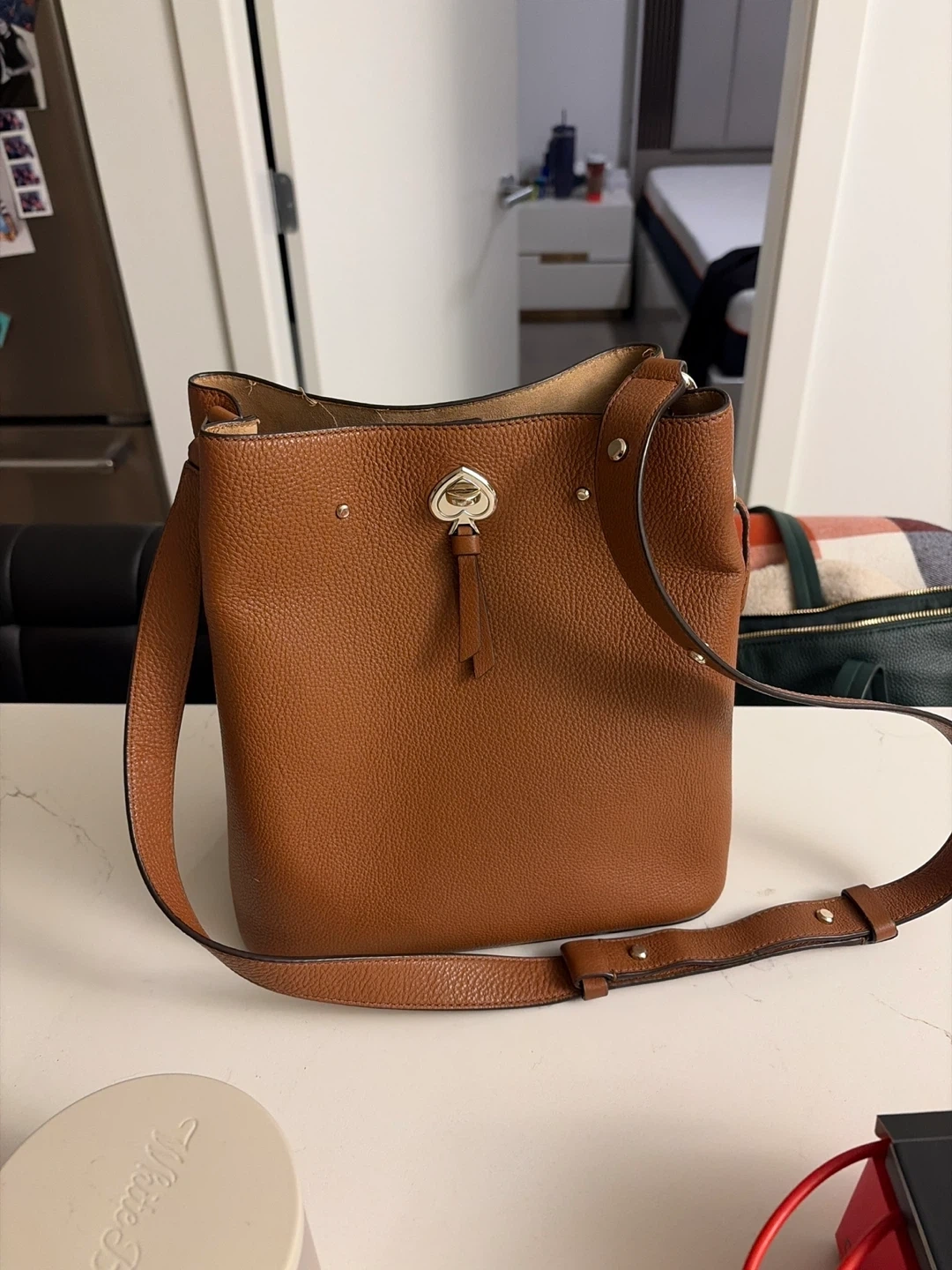 This is a classic Kate Spade bucket bag in a rich brown pebbled leather. It features a secure closure and adjustable strap for comfort. The bag's versatile design makes it suitable for everyday use.