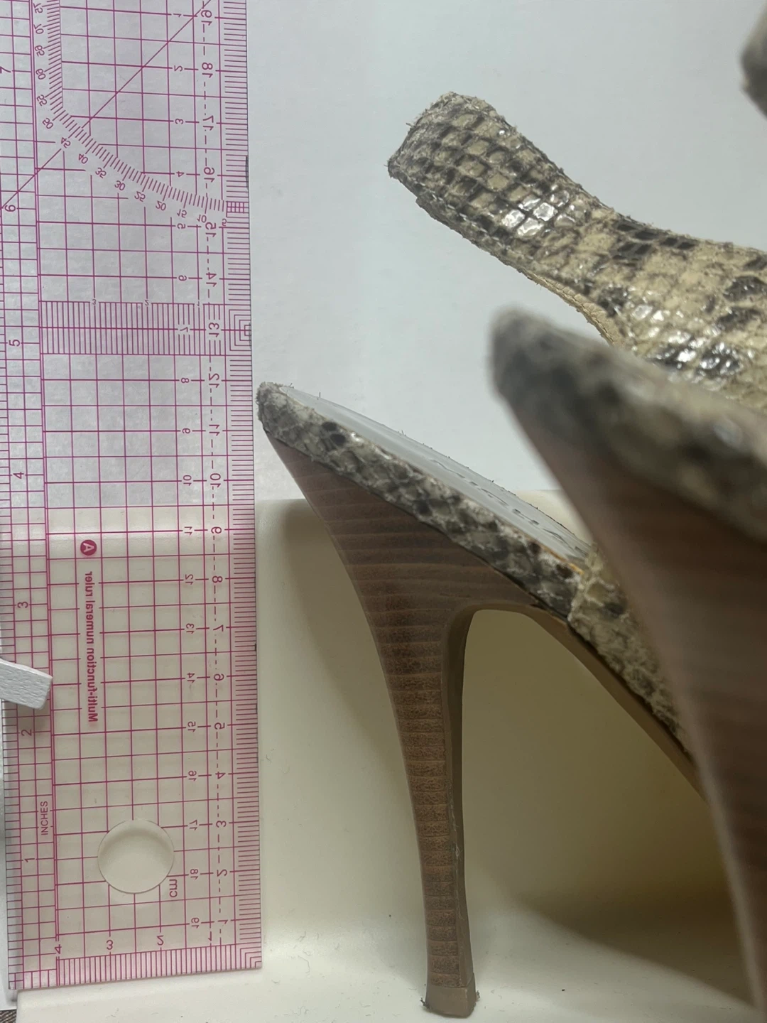 These Michael Kors heels feature a cool snake print and a stylish zip detail. They're a size 8M. 11 cm or 4” hills.The wooden heel adds a nice touch!