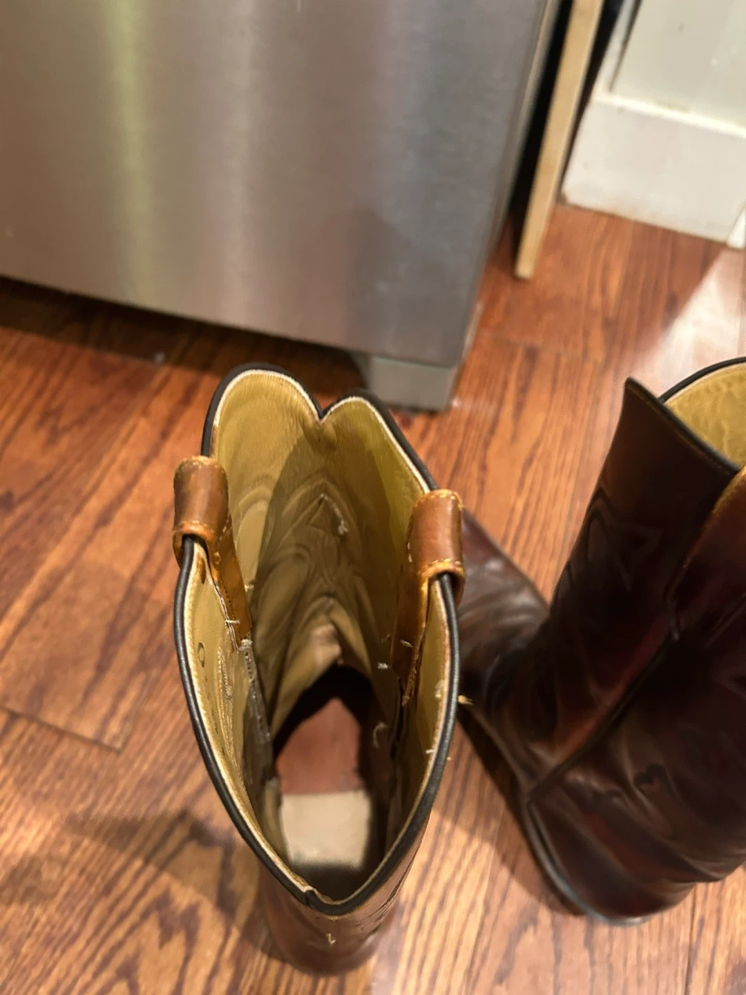 Selling a pair of well-loved brown leather cowboy boots. They have a cool, classic look with detailed stitching. Perfect for adding some western flair to your wardrobe! They show signs of wear but are still in good condition.
