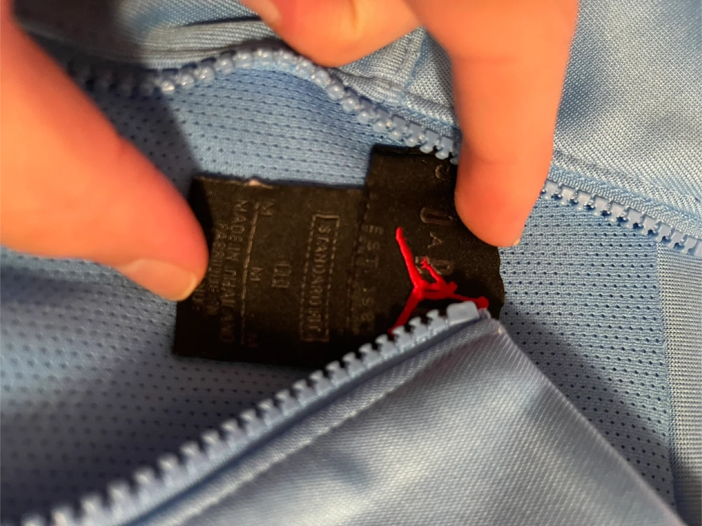 This is a Jordan tracksuit set in a bright blue colour. It's made of a smooth polyester material. The set includes a zip-up jacket and matching pants. It's a size medium.