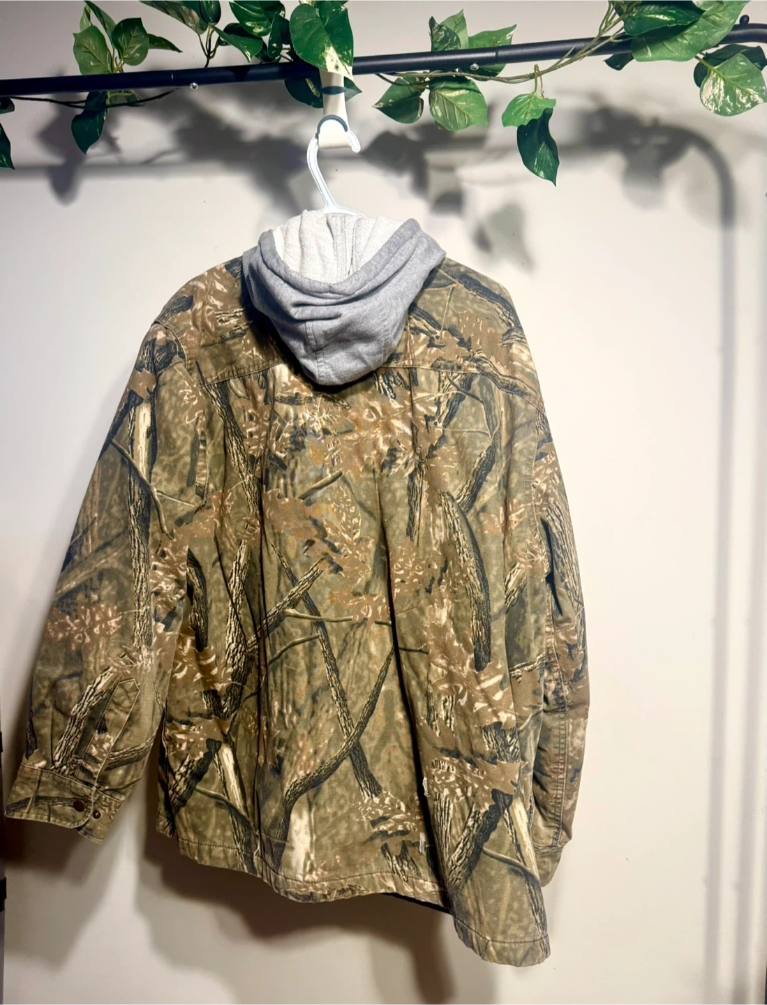 This men's jacket features a camouflage pattern with a grey attached hood. It's made from a durable canvas material with button closures. Plenty of pockets for storage!