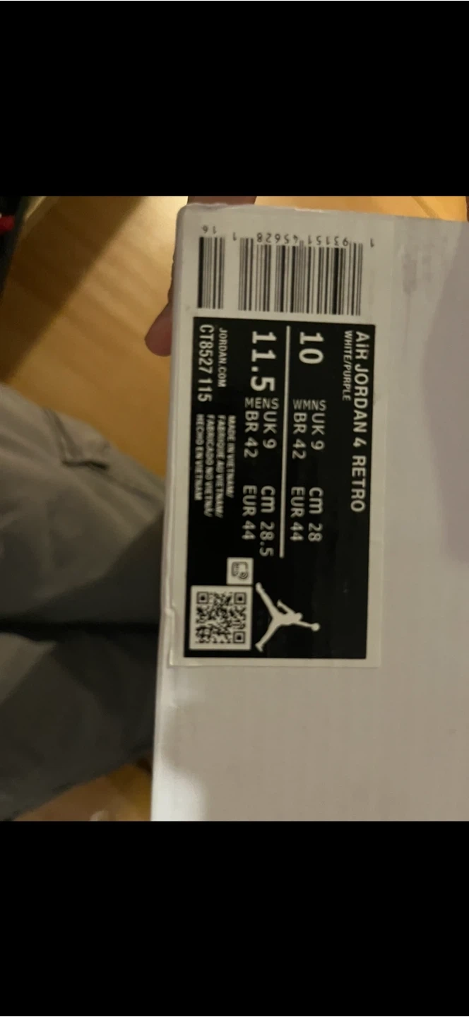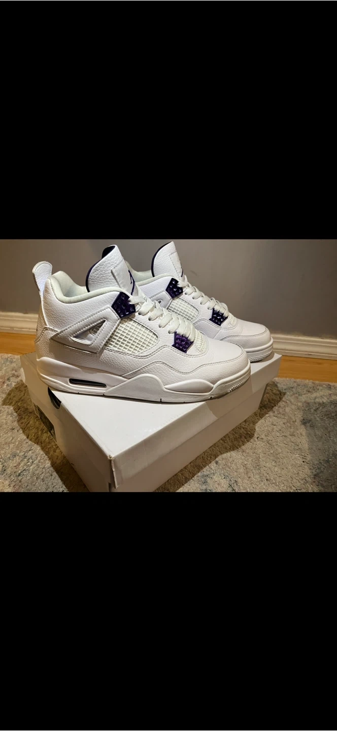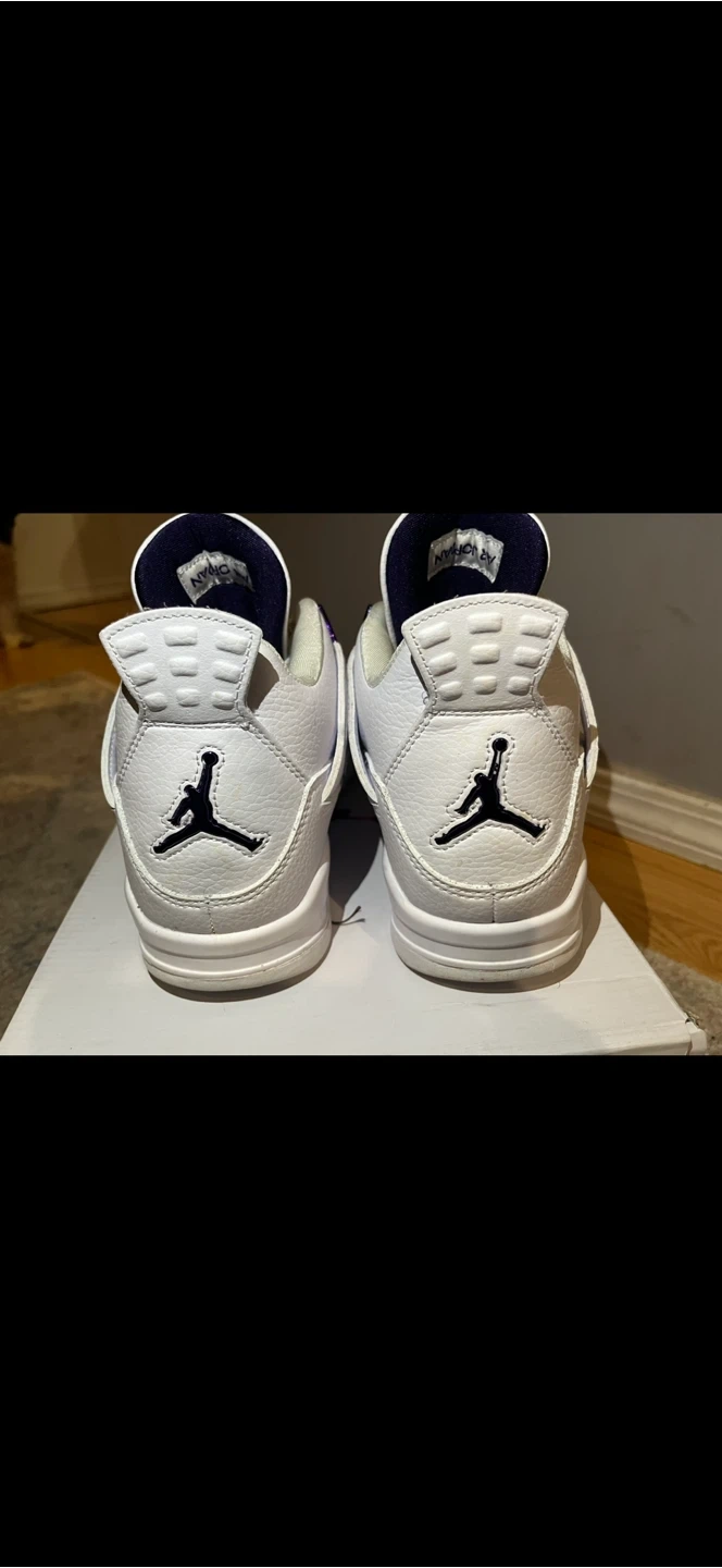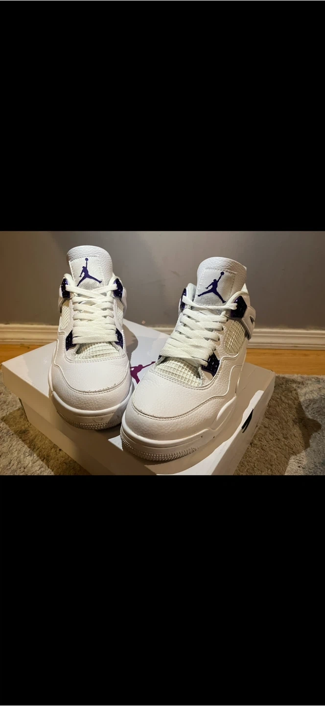 Classic Air Jordan 4 Retro sneakers in a white and purple colourway. Includes original box. Men's size 10.