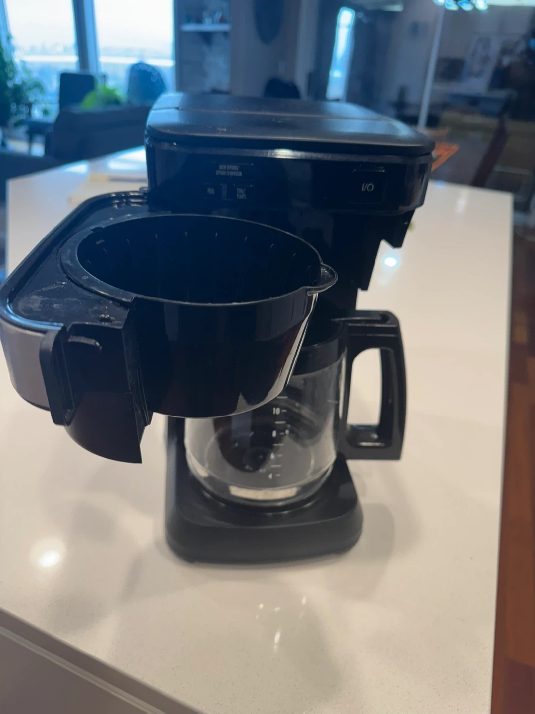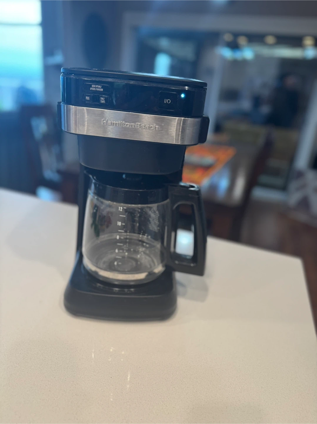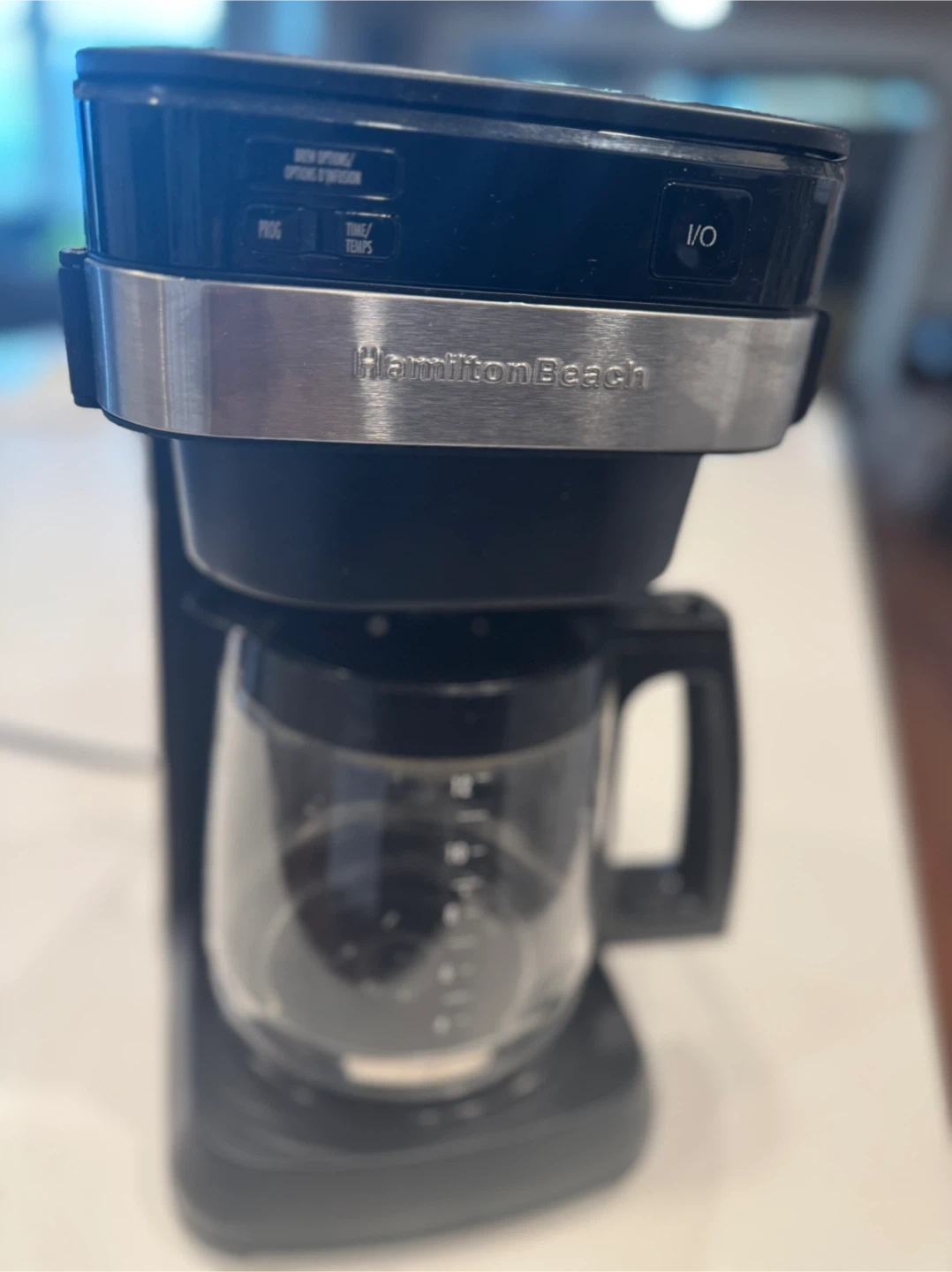 This is a Hamilton Beach coffee maker. It has a 12-cup glass carafe and a programmable brew function. It's ready to make your morning coffee!