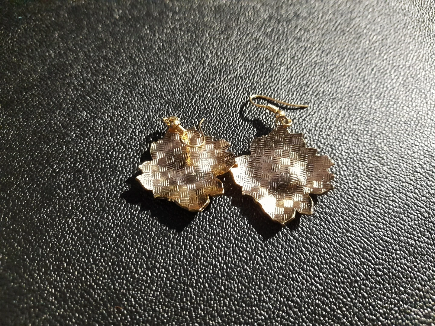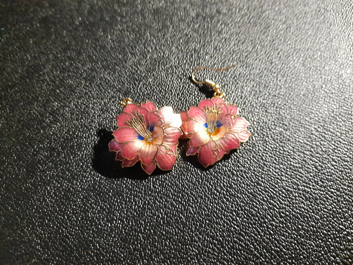Pretty flower dangle earrings with a pink and yellow enamel finish. They're lightweight and have a gold-tone hook closure. Perfect for adding a touch of floral charm to any outfit!