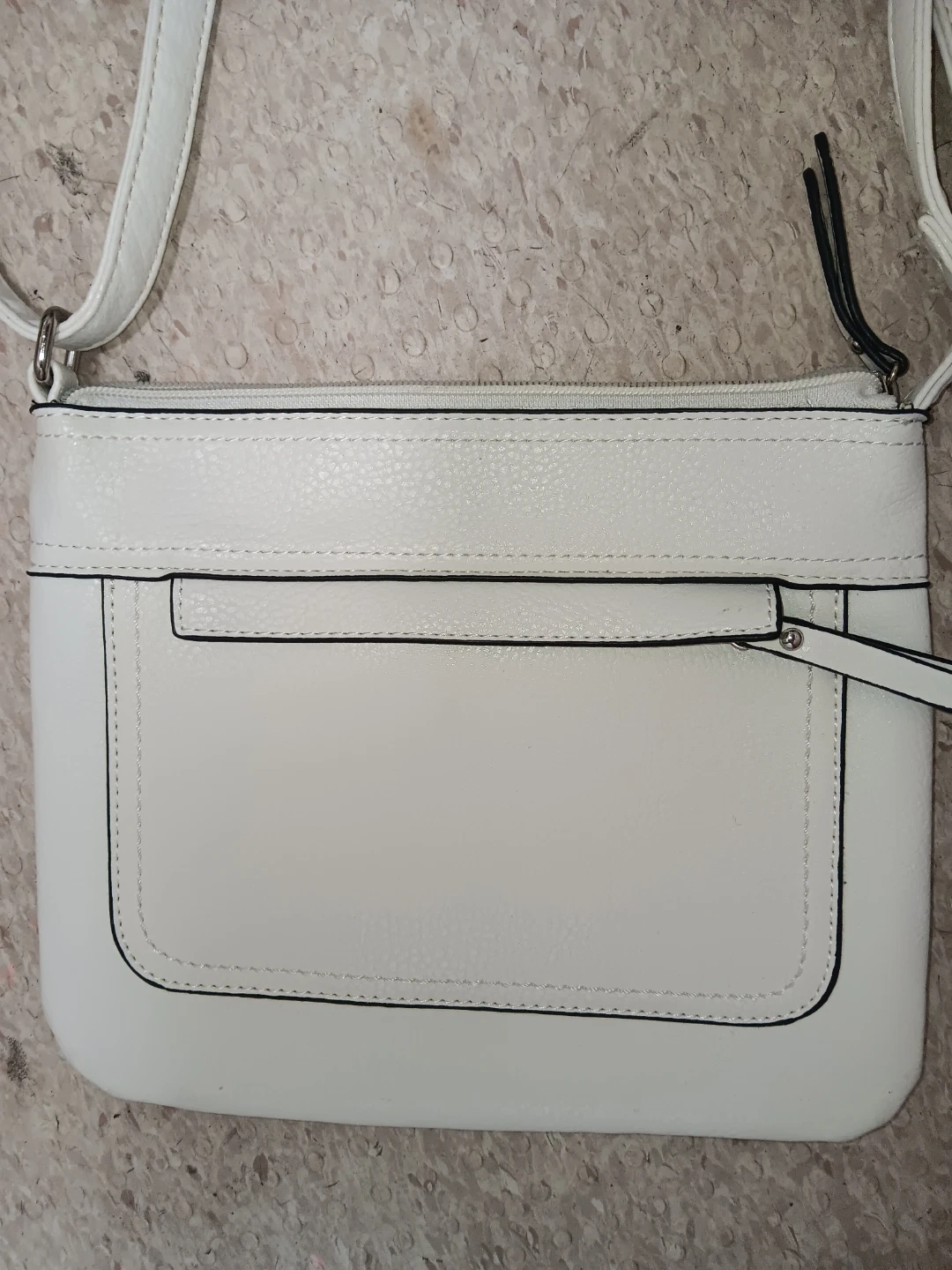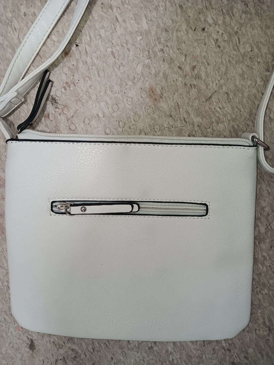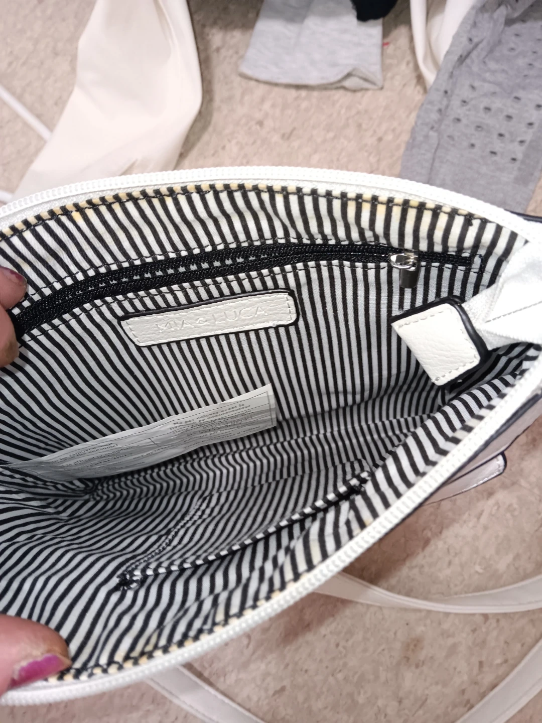 This is a white Mia & Luca crossbody purse. It's made of faux leather with a striped interior lining. Features include a zip top closure and a front pocket.