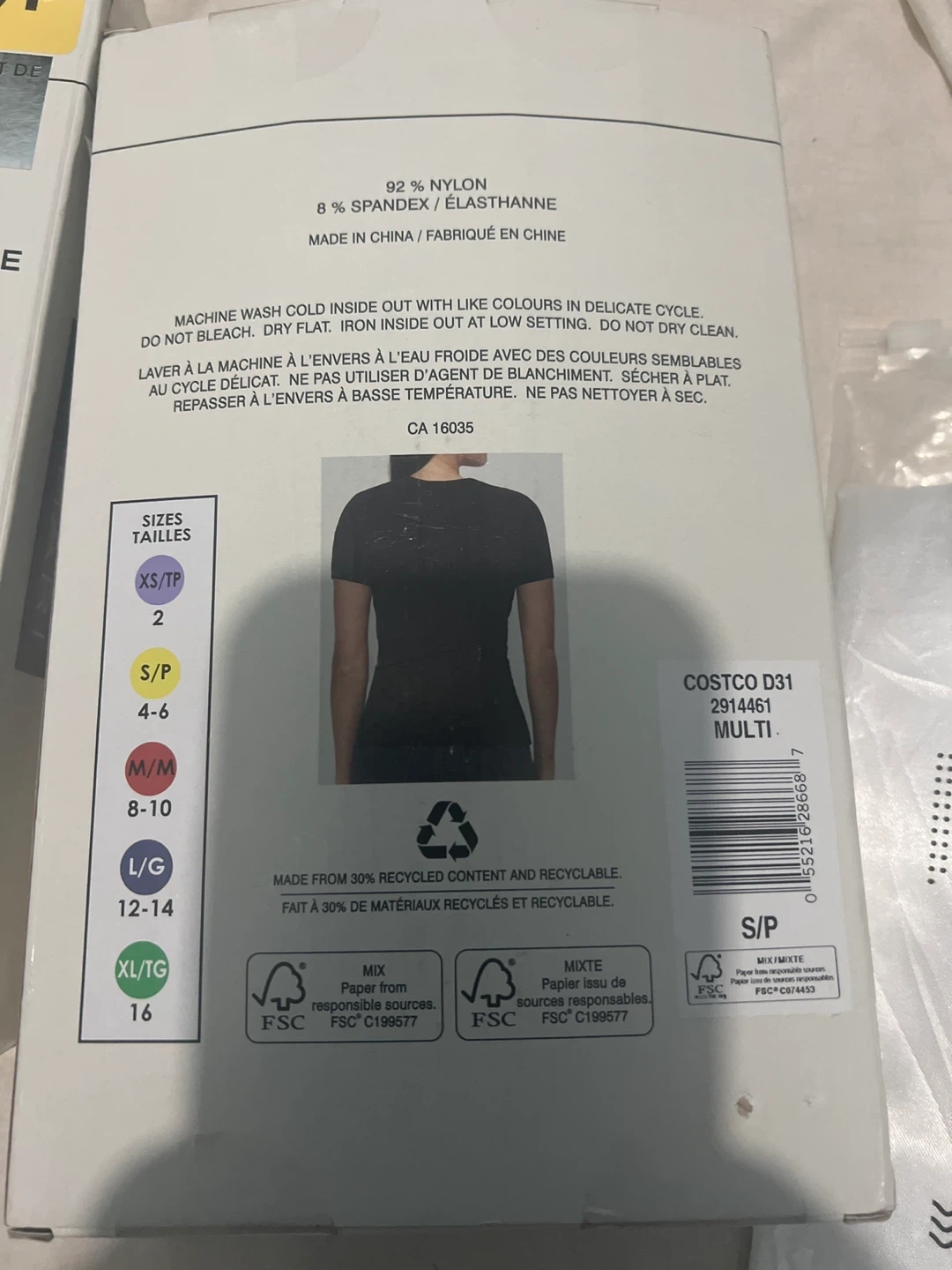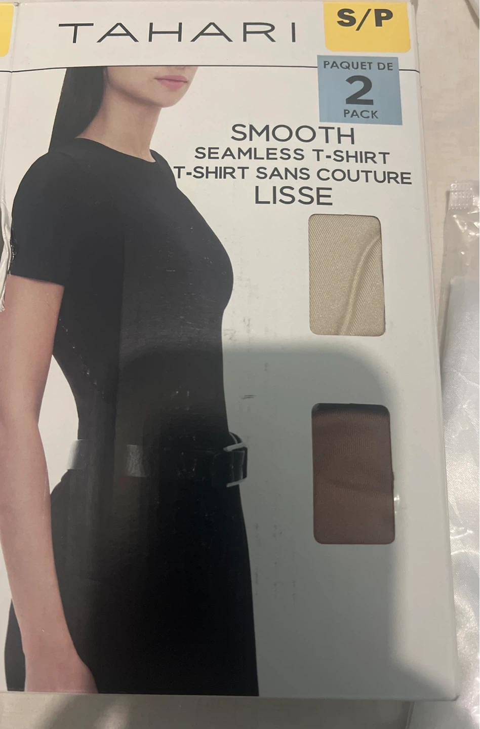 This is a 2-pack of Tahari women's smooth seamless t-shirts. Made from 92% nylon and 8% spandex for a comfortable stretch. Available in size S/P.