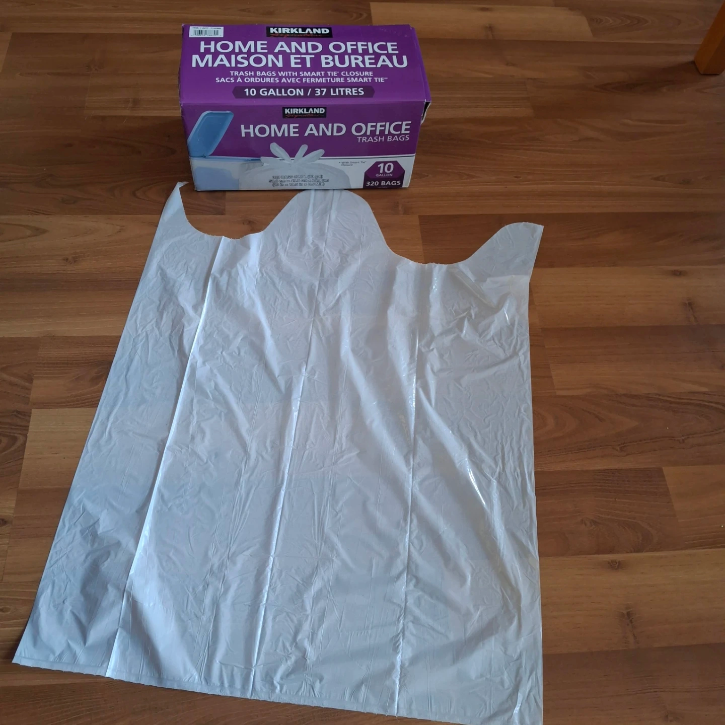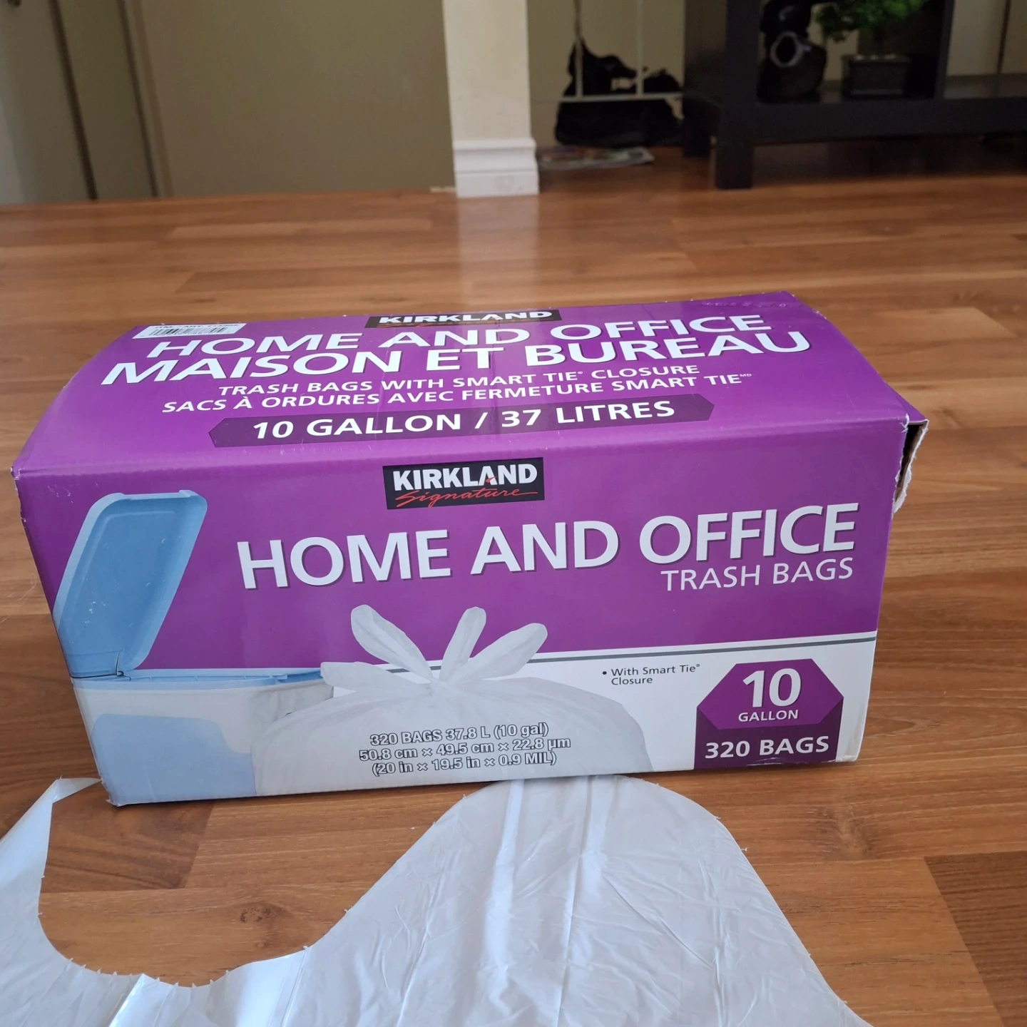 320 Kirkland Signature Home and Office trash bags with Smart Tie each measuring 24.6 in x 22.5 in (0.92 MIL). These bags are suitable for both home and office use.