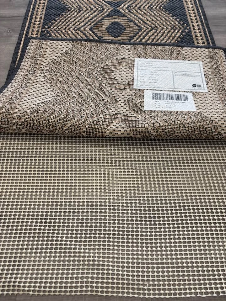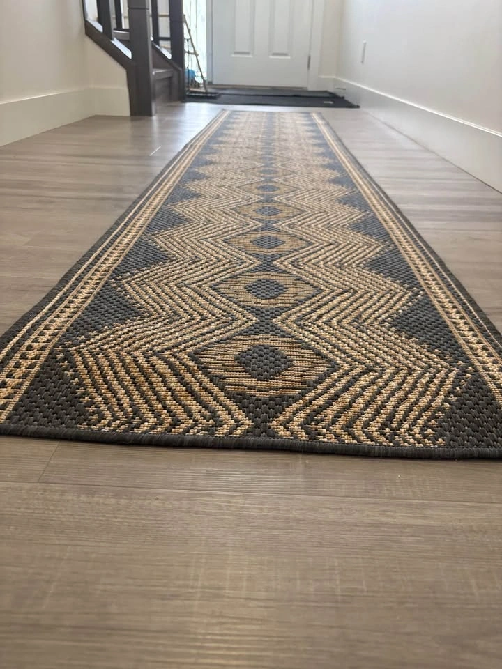 Modern geometric runner rug in great condition – perfect for hallway, entryway, or even outdoor use. Size: 2 ft x 10 ft. Colour: Dark grey with beige pattern. Durable flatweave (easy to clean). Indoor/outdoor use. Includes rug pad. Less than 1 year old – selling due to moving. Pick up Carrington NW.