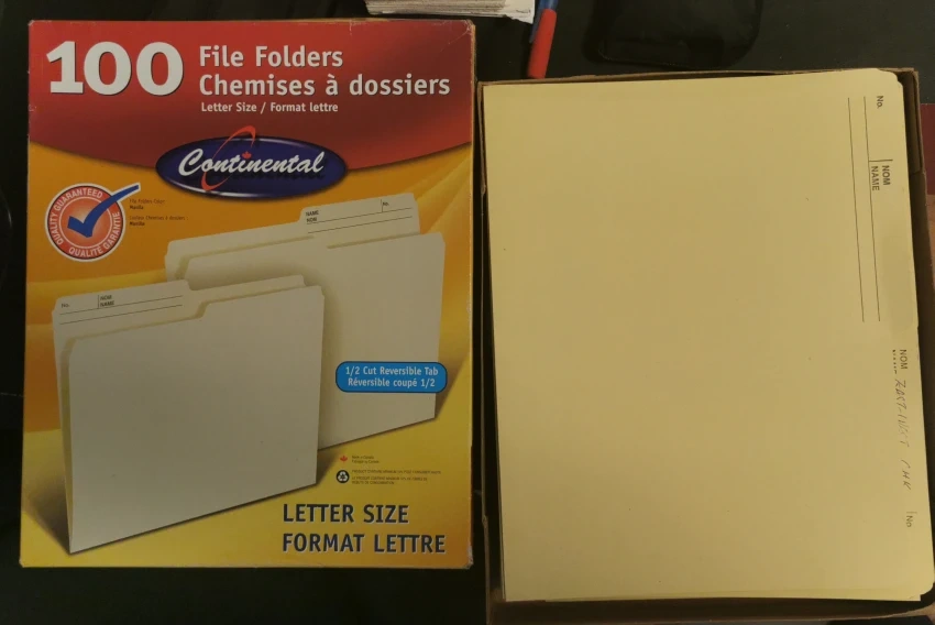 Selling a box of Continental file folders, letter size! There are 80 folders in total(60 new +20 used). They feature a 1/2 cut reversible tab. Perfect for keeping your documents organized!