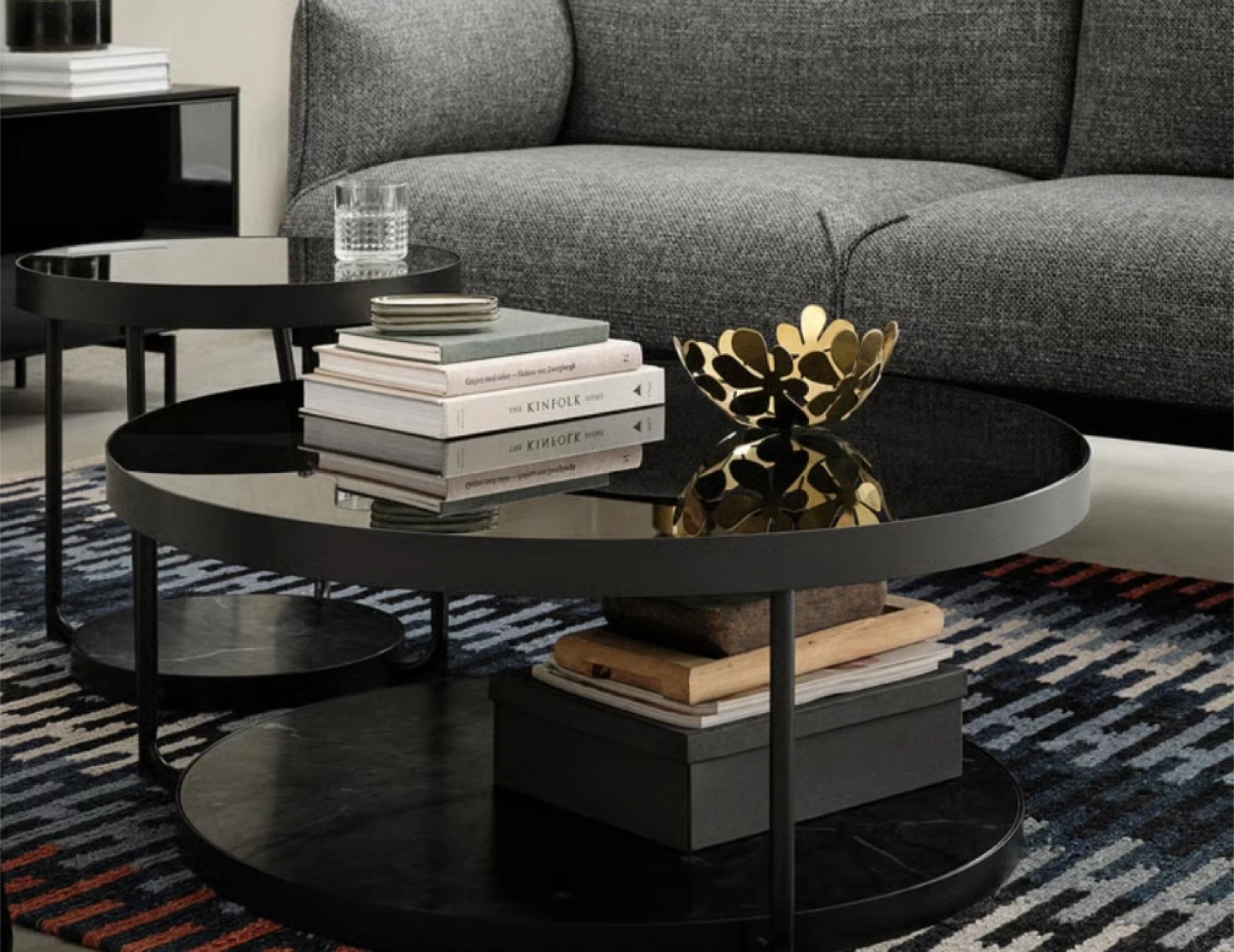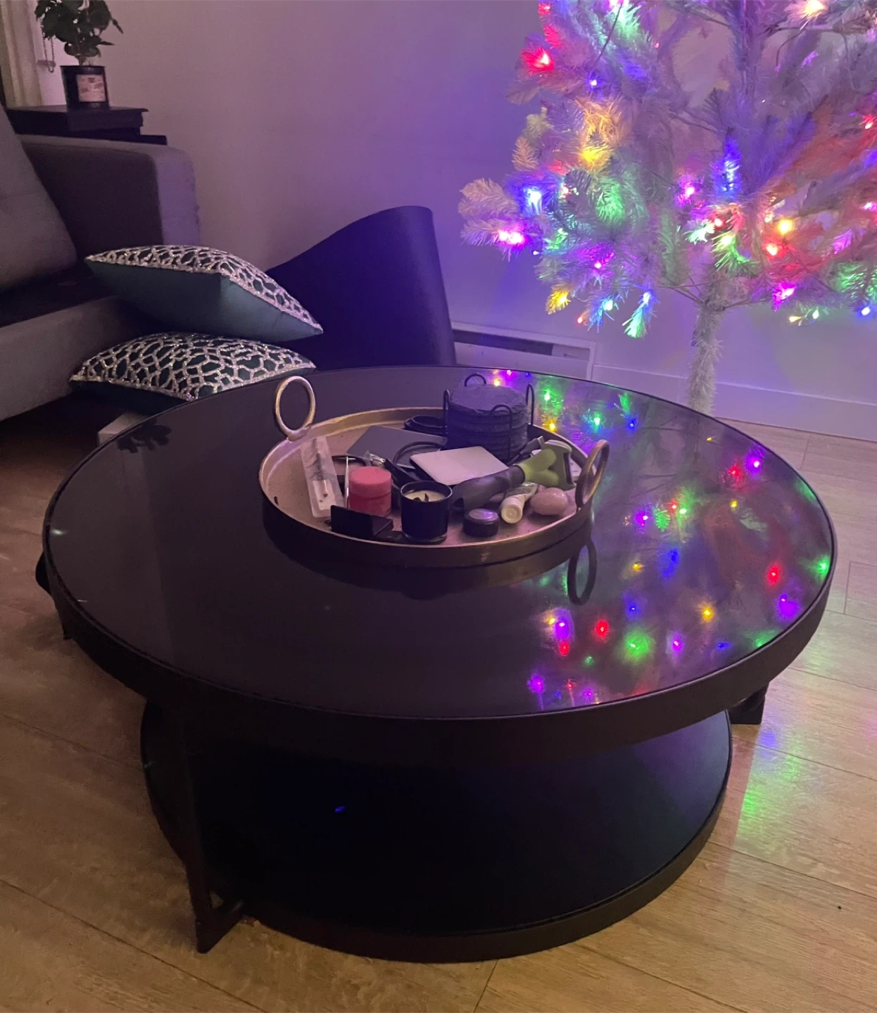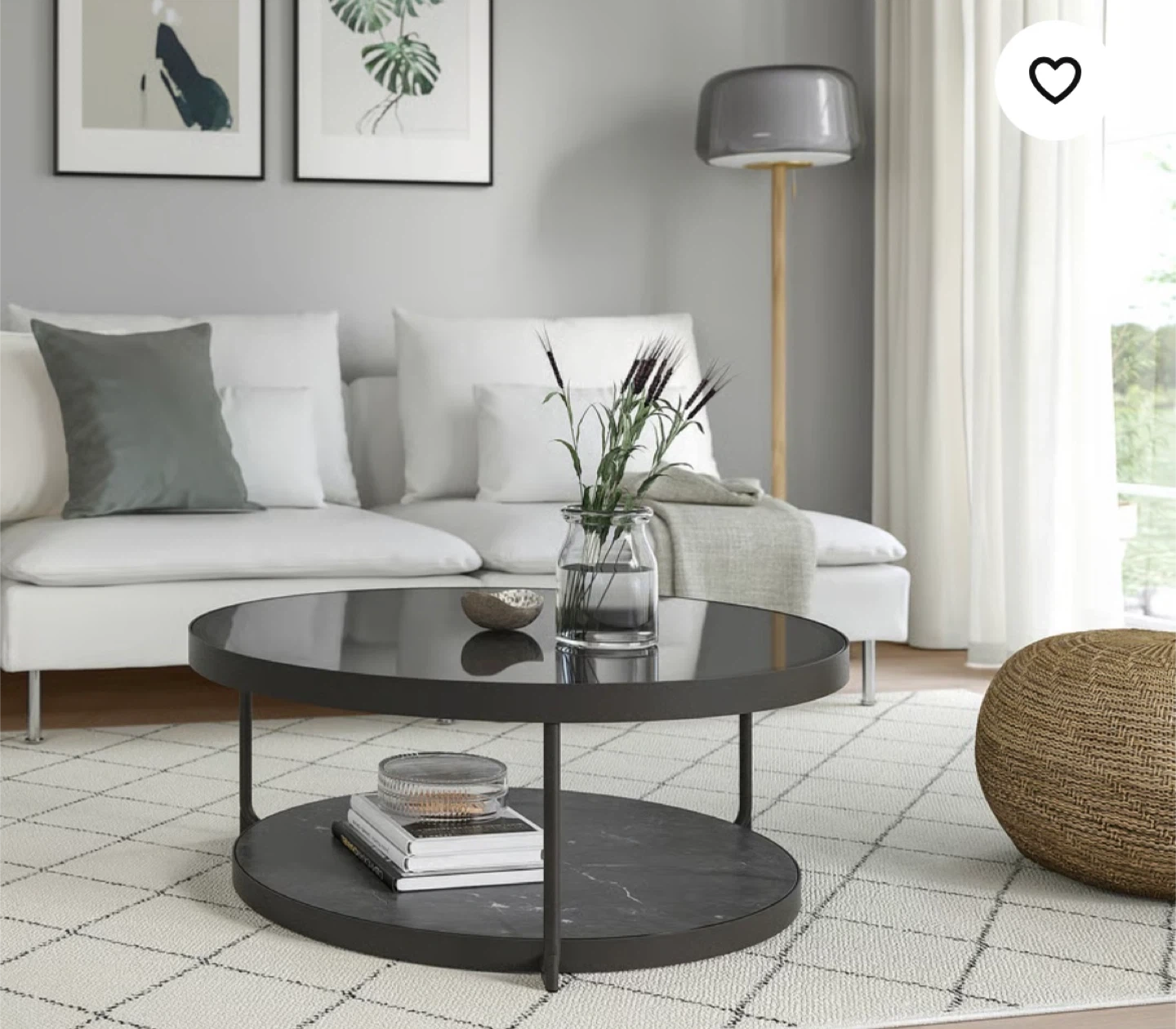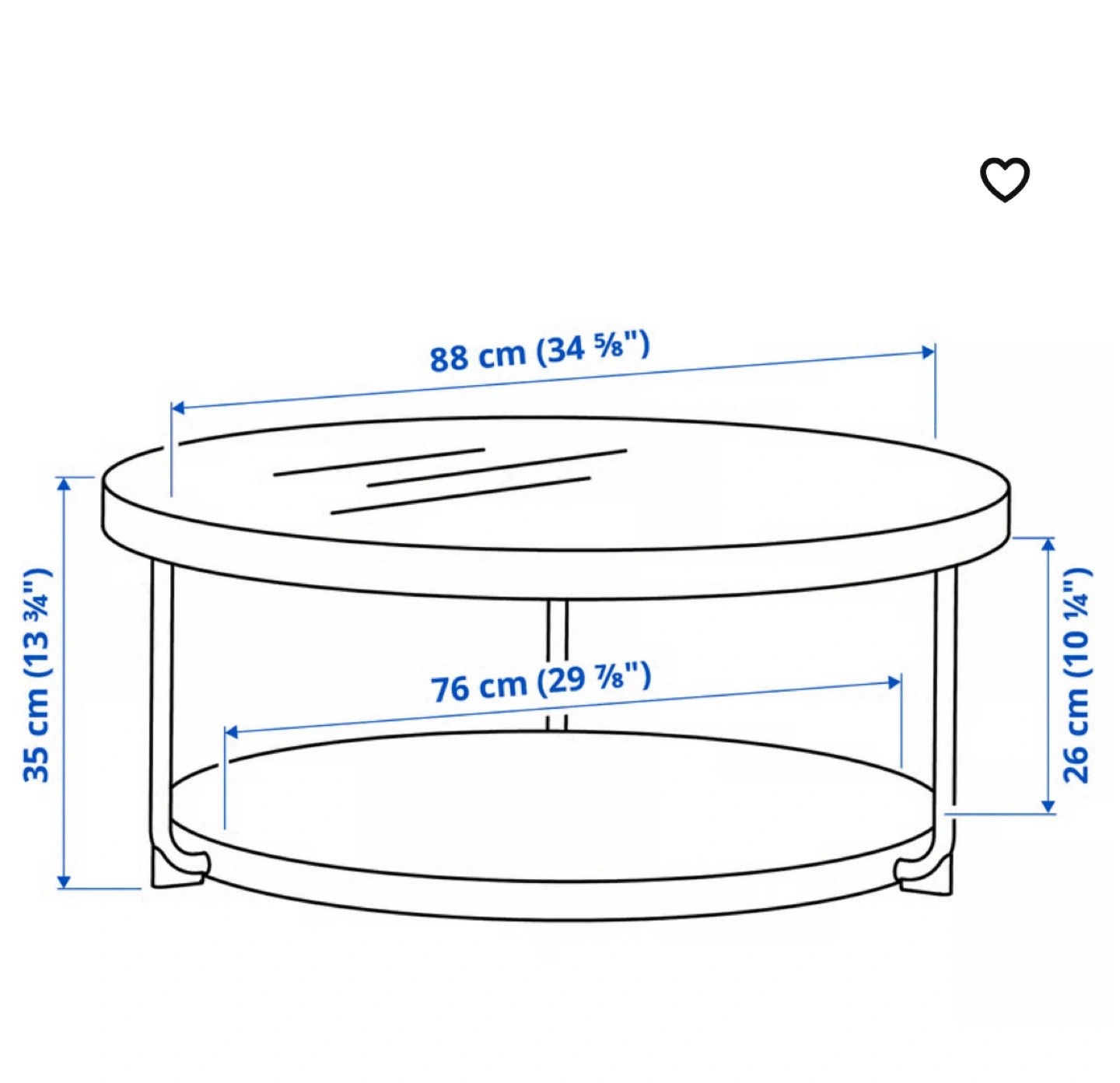 Black coffee table. It has a diameter of 88 cm and a height of 35. Sleek glass top and a reverse black Matte black bottom ( it also has a marble print on the other side) but I chose to use the all black side. You can reverse this if you prefer. I’ve had mine for 6 months and it’s in impeccable condition.