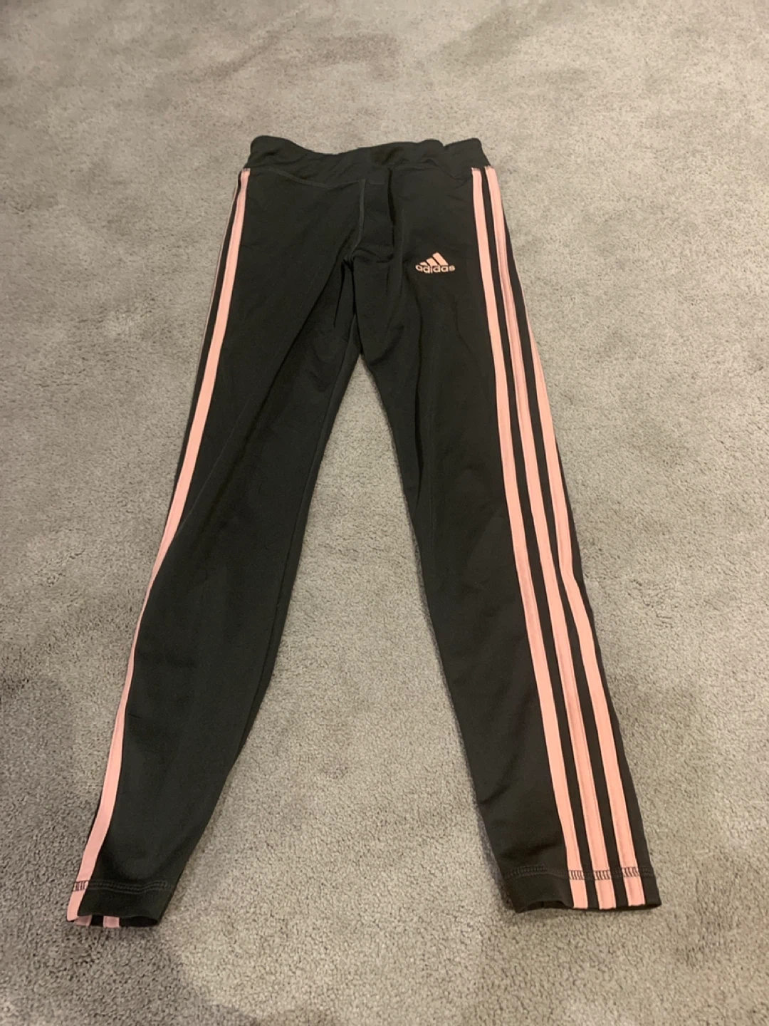 Black Adidas track pants with pink stripes. Made with Aeroready material. Size M/M 152.
