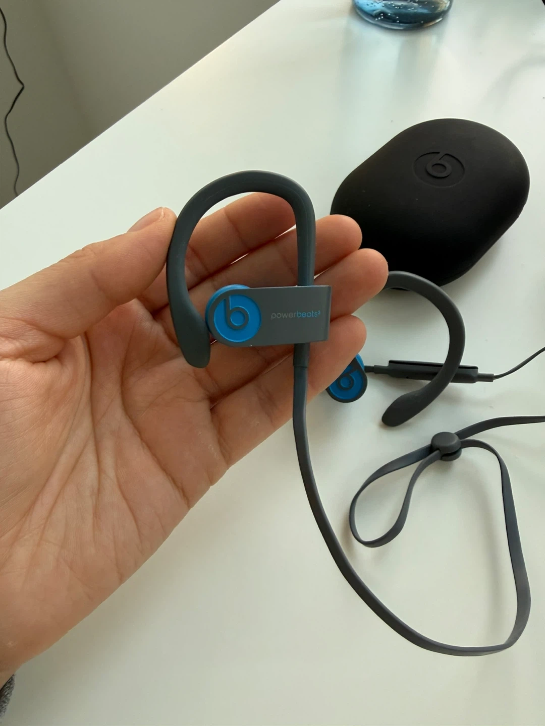 Selling a pair of Powerbeats Pro wireless earphones in blue and grey. They come with the charging case and the adjustable earhooks for a secure fit. These are great for workouts or just listening to music on the go!
