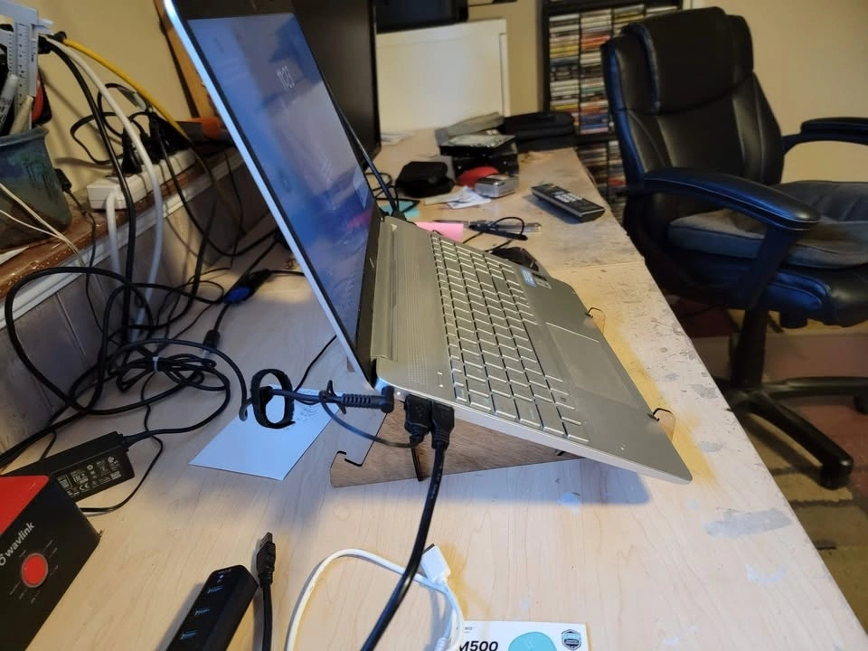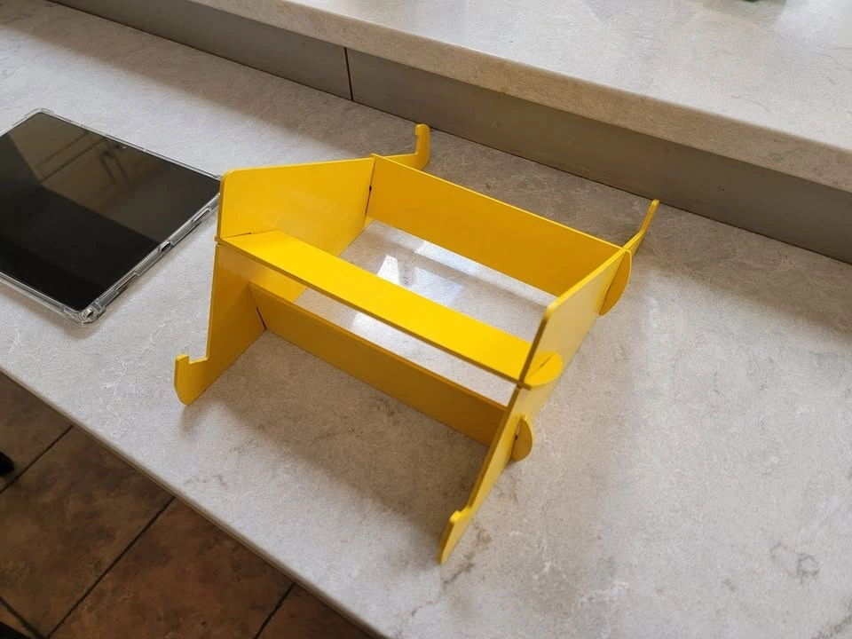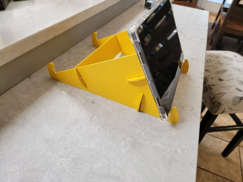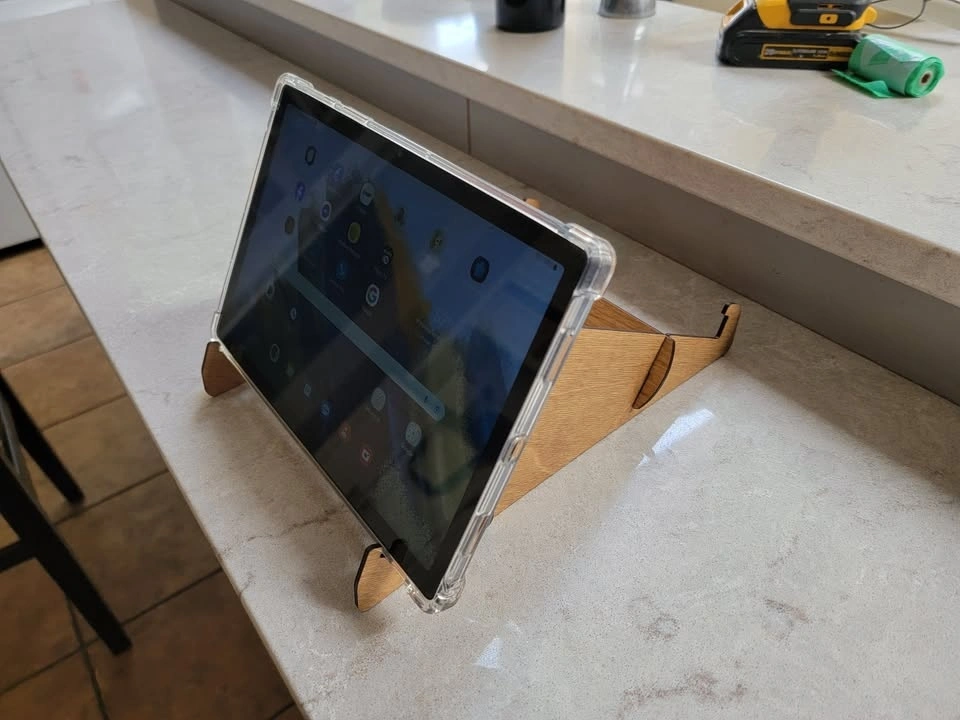 These stands can be custom engraved and made to order. Right now I have a painted one (Yellow) and a Clear Wood stained one as shown in Photos. Made from Baltic Birch. Can easily make more. Shown here with my Samsung A8 Tablet and an HP Laptop of mine. Happy to answer any questions. Folds up flat for portability if you don't want to glue it together and leave it assembled.