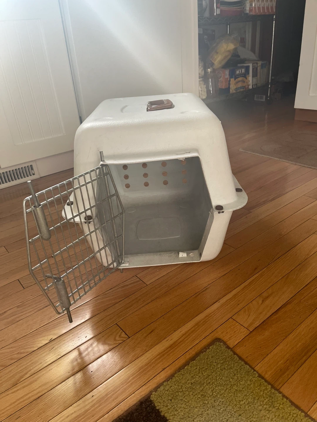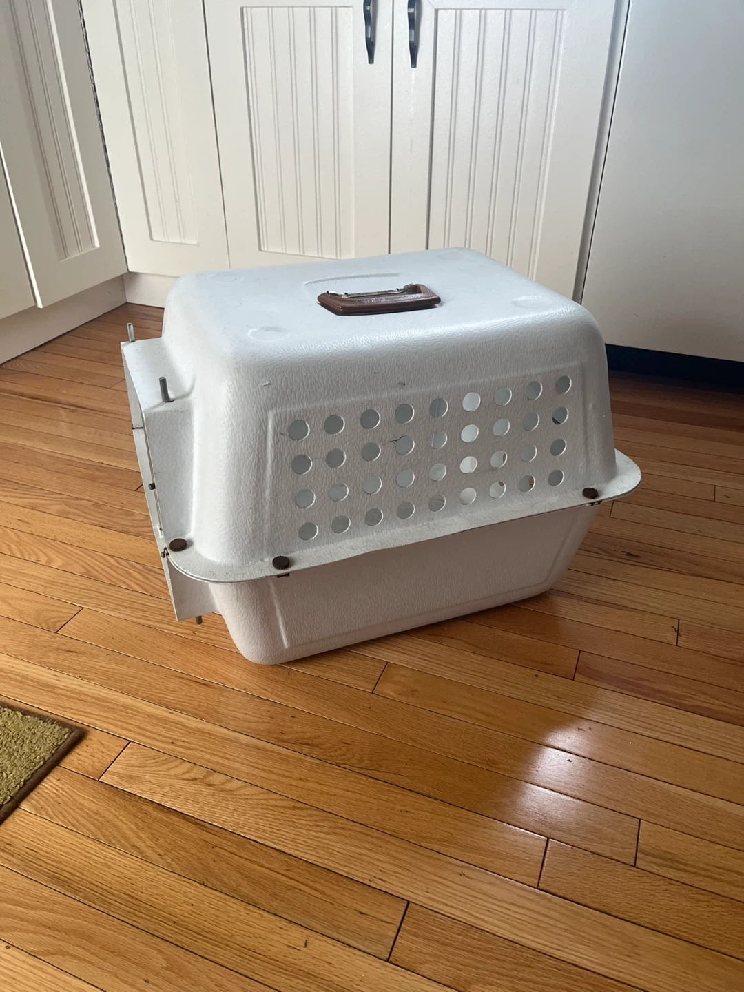 This is a sturdy white pet carrier. It has a metal latching door and ventilation holes on the sides. It's great for safely transporting small to medium pets. The top handle makes it easy to carry.
