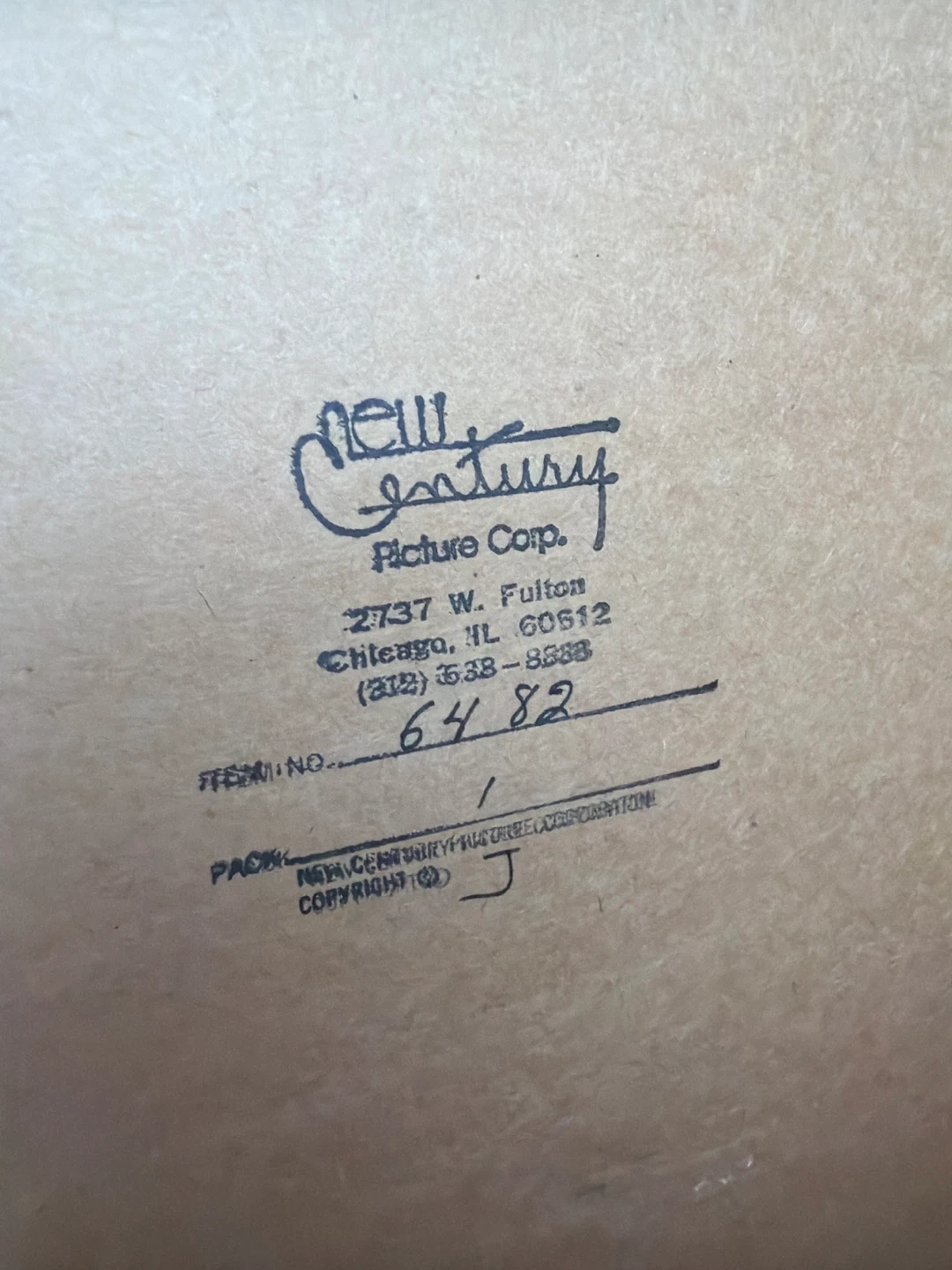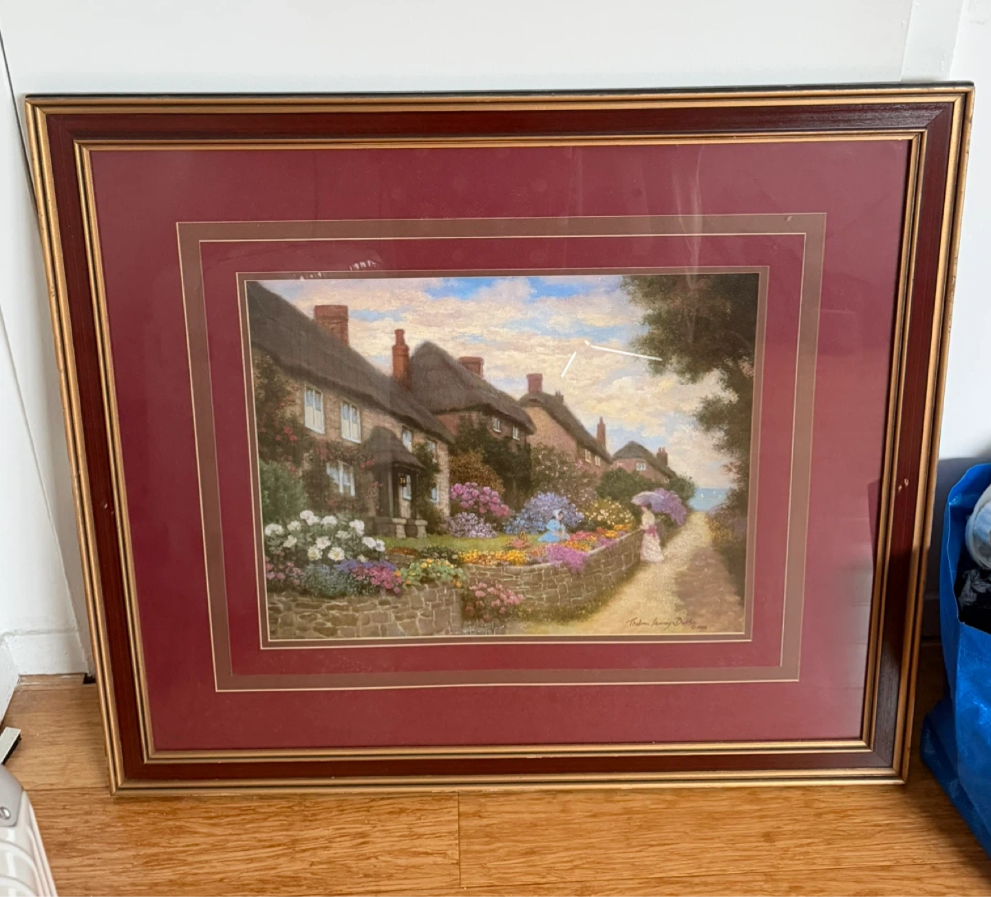 Charming framed print depicting a picturesque village with thatched-roof cottages and a garden path. It's matted with a burgundy and gold frame.
