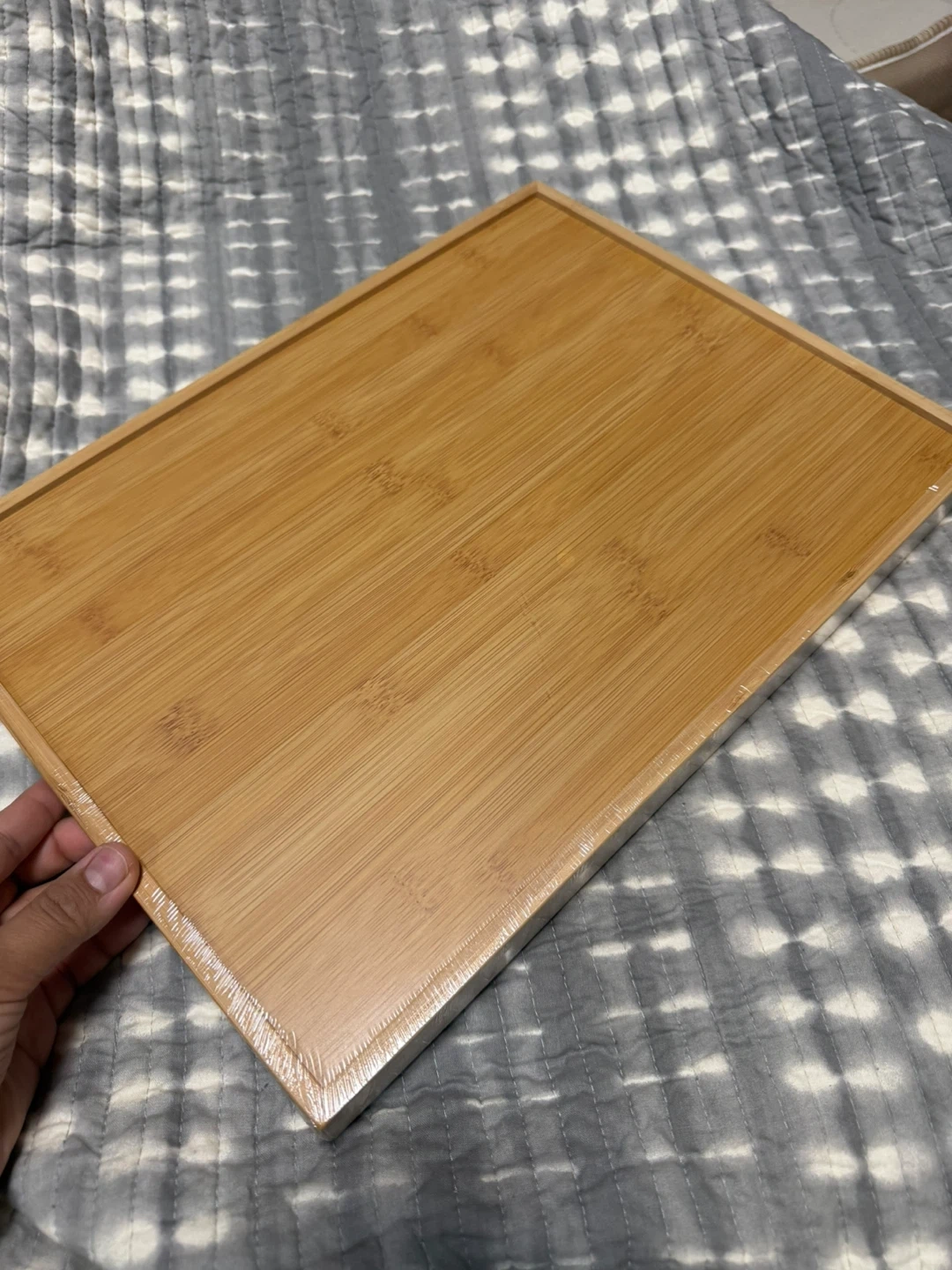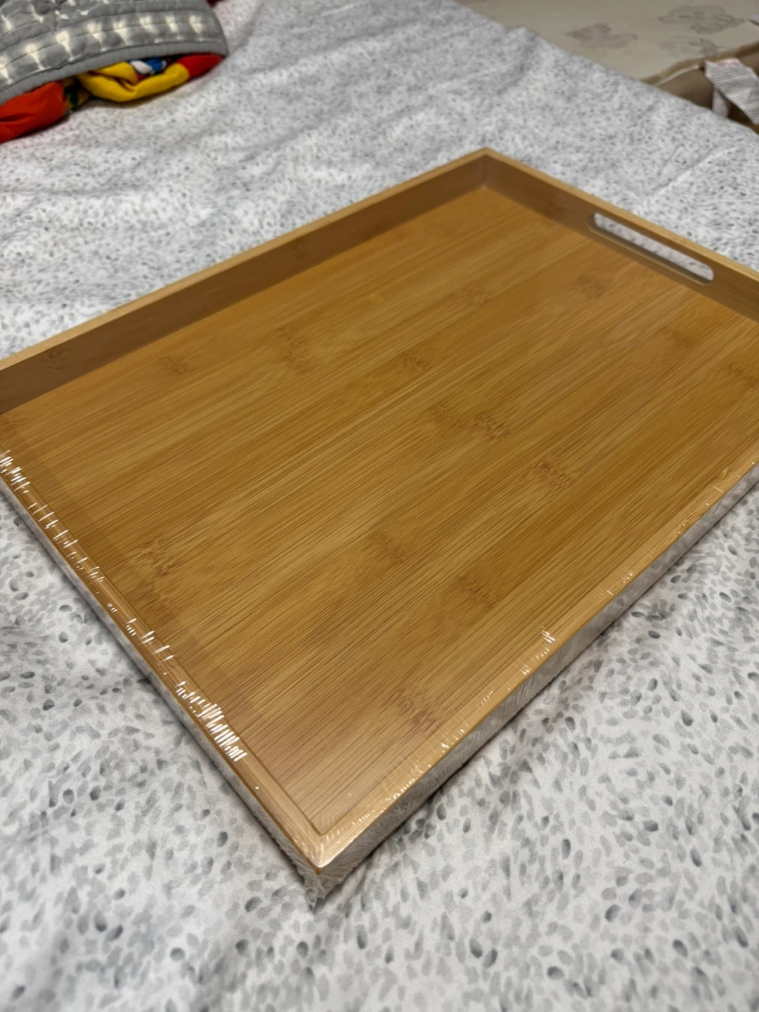Bamboo serving tray with built-in handles. It's perfect for serving food or drinks. Made from natural bamboo material.