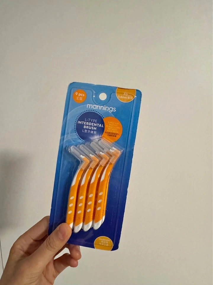 Sealed pack of L-Type interdental brushes. Has 9 brushes, 0.8mm size. Super slim bristles good for getting deep between teeth. Keep your smile sparkling.