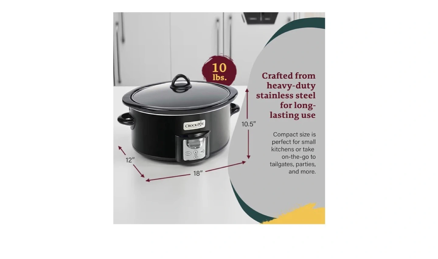 This Crock-Pot slow cooker has a 4-quart capacity and a digital countdown timer. It features a sealed glass lid and warm temperature settings. It's crafted from heavy-duty stainless steel for long-lasting use. This compact size is perfect for small kitchens.